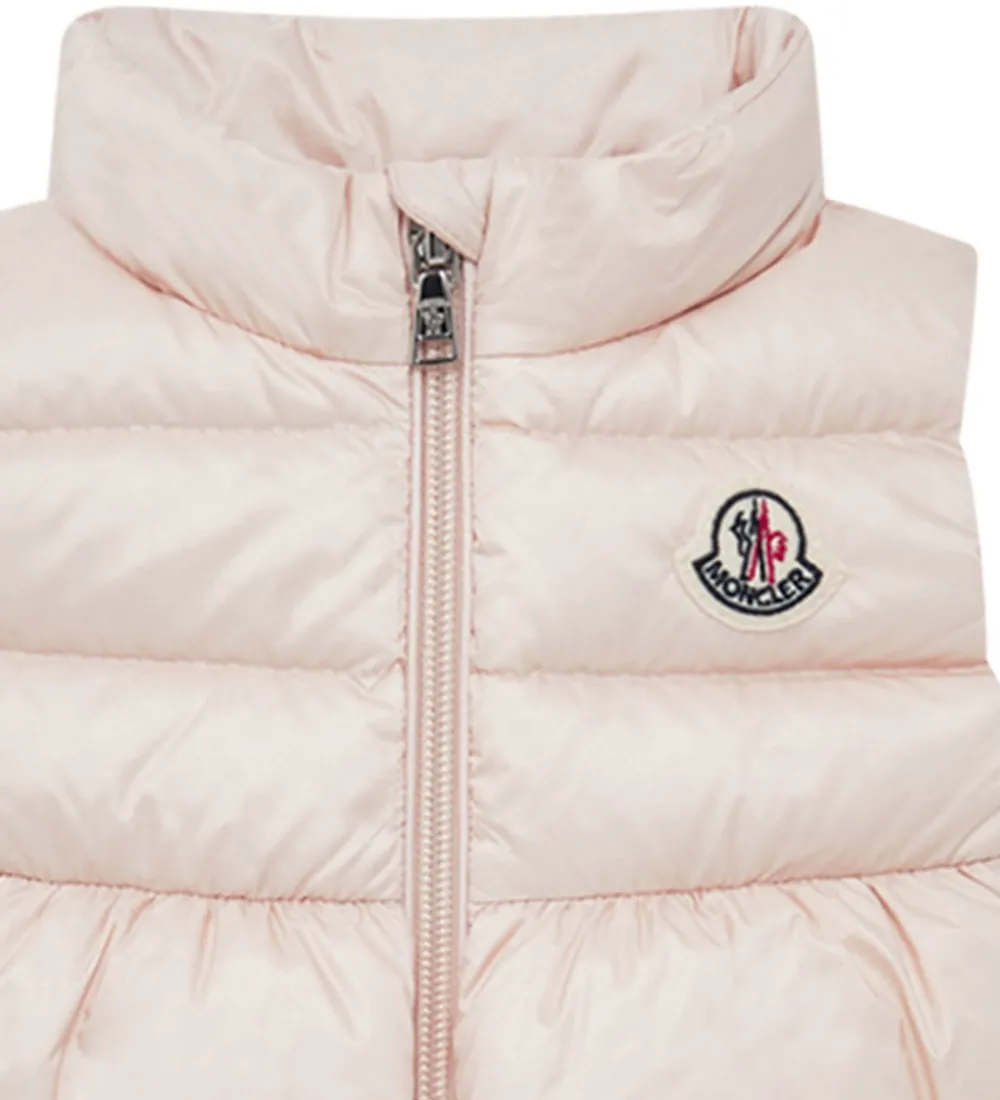 Fin Moncler dunvest i ensfarvet pudderrosa, og fortil i venstre side sidder der et filt-mærke med et Moncler-logo.