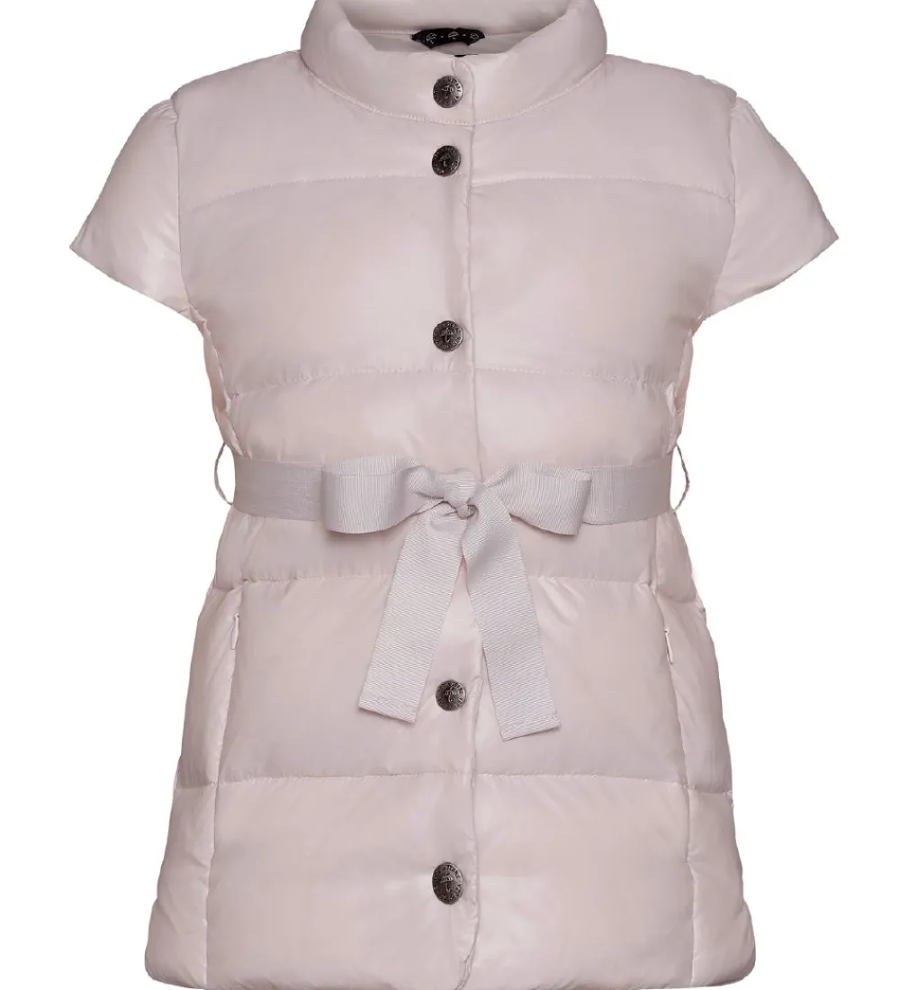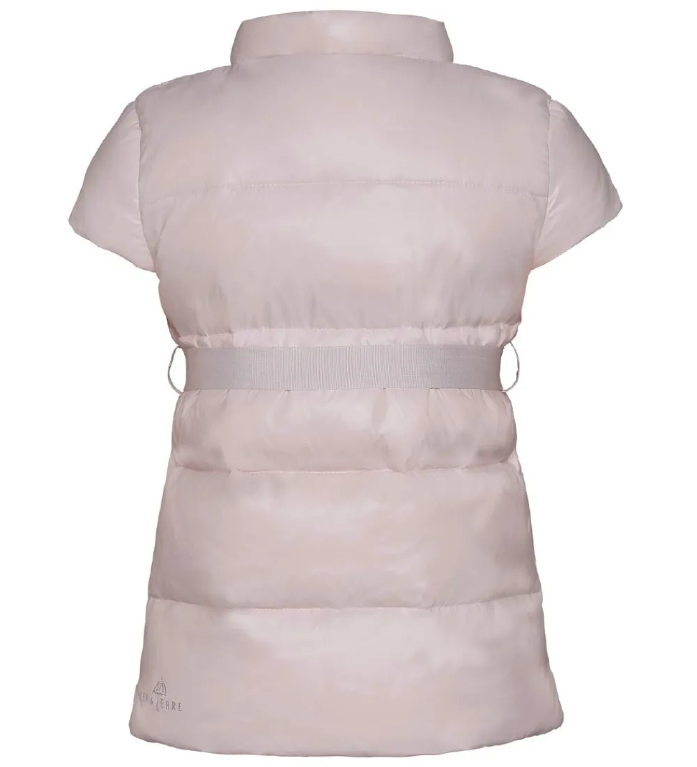 Sød Ver de Terre dunvest i pudderrosa og med et pudderrosa bælte i livet. Dunvesten er lavet i et glatvævet materiale med vandrette syninger, der giver et klassisk dunjakke look.