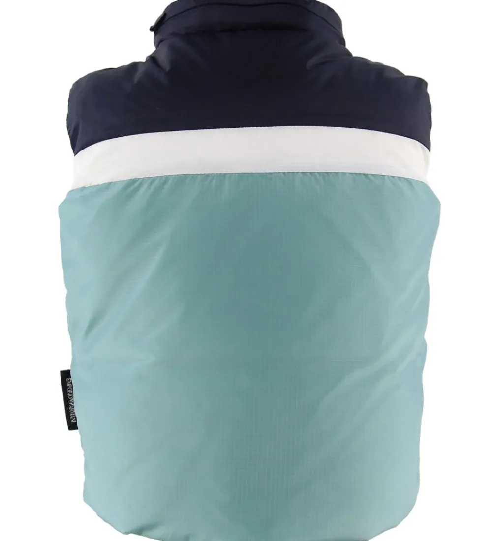 Lækker Emorio Armani dunvest i støvet turkis, og i toppen er den navy. Mellem de to farver er der en bred, hvid stribe. Fortil i venstre side sidder der et sølvfarvet metalmærke med et logo.