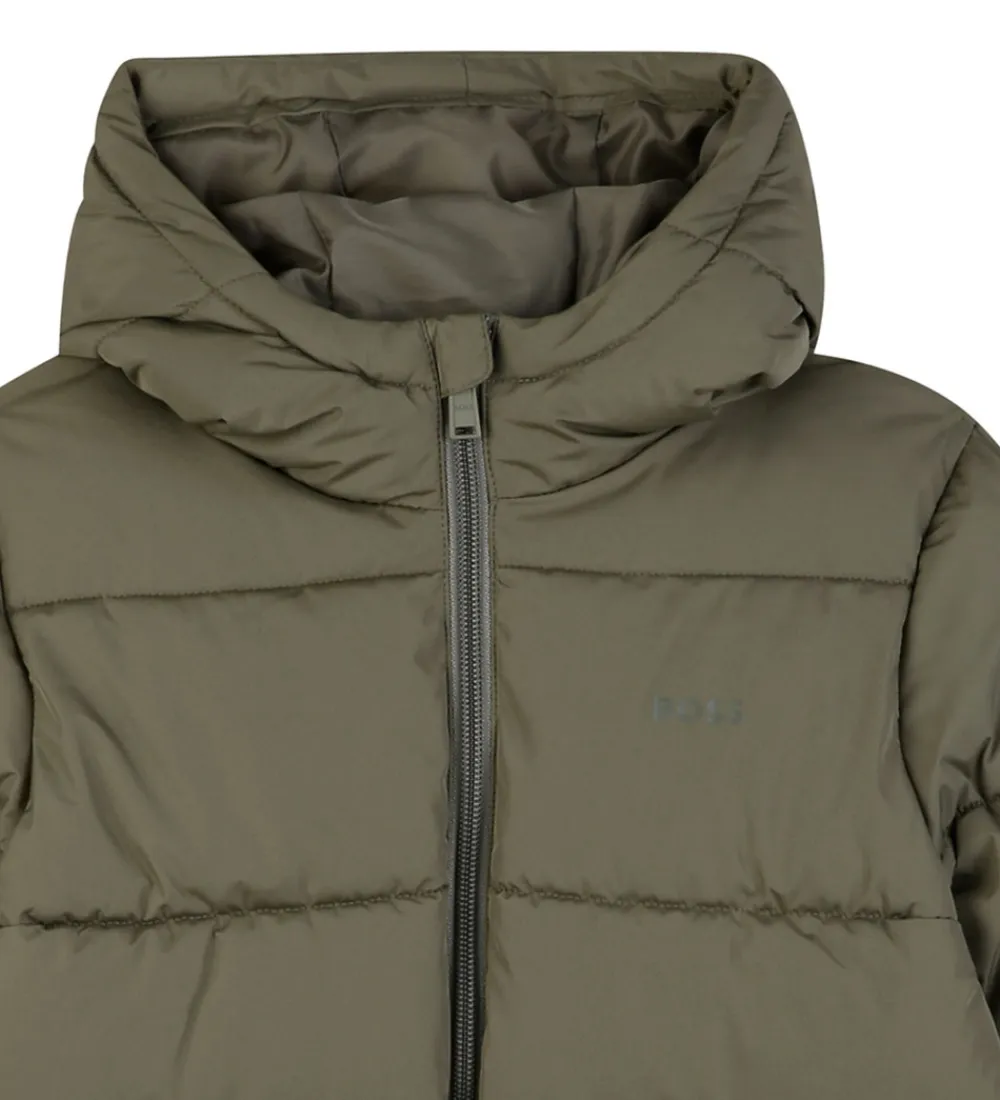 BOSS dynejakken har en fast hætte, og ærmerne har brede elastikkanter. I bunden har dynejakken en indvendig elastikkkant. Dynejakken lukkes med en lynlås med hagebeskytter og indvendig vindstolpe, og fortil sidder der to store klaplommer, som lukkes med en skjult trykknap. Dynejakken har et glatvævet for, og den har en lun og letvægtig polyestervattering med Thermolite EcoMade. Dynejakken har fået en vandafvisende behandling, så vand ikke så let trænger igennem.
