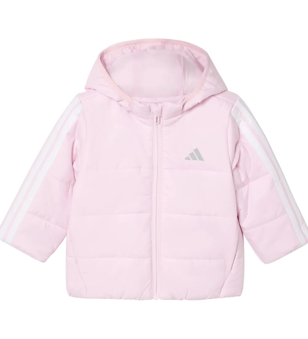 Fin adidas Performance dynejakke i lys rosa med hvide logostriber ned ad ærmerne, og fortil og nederst på ryggen er der et praktisk refleksprint.