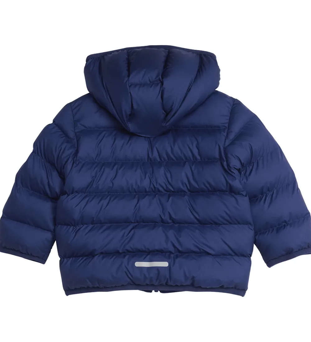 Smart adidas Performance dynejakke i blå med kontraststriber i lysere nuancer over brystet. Fortil og nederst på ryggen er der et praktisk refleksprint.