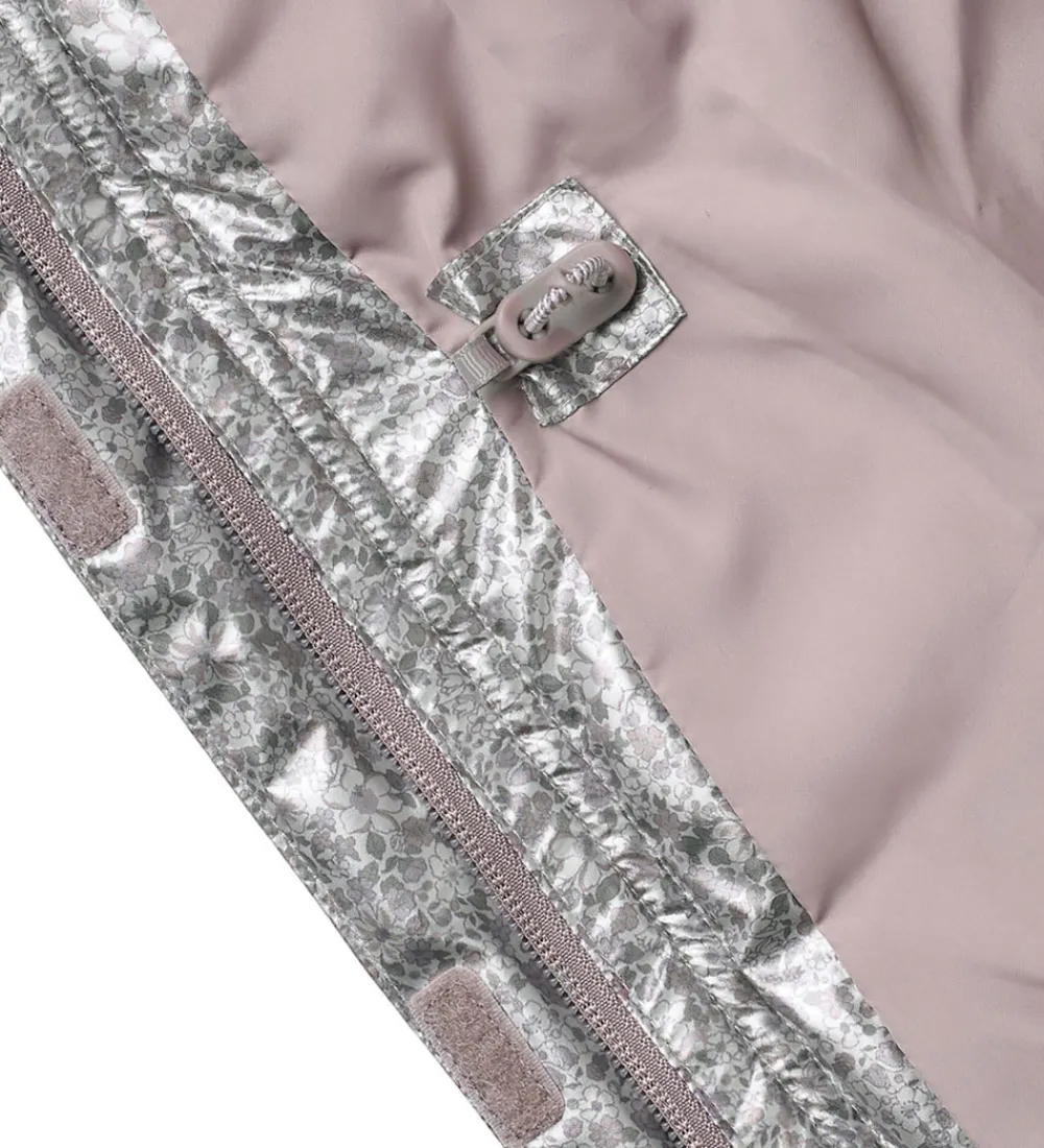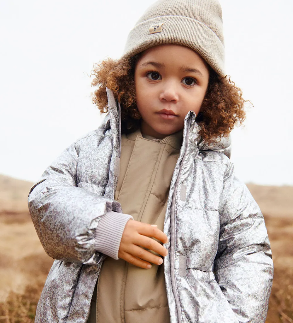 Lækker Wheat dynejakke i en skinnende sølvfarve med et alloverblomsterprint i støvet lilla, rosa og grønne farver. Dynejakken har vandrette syninger.