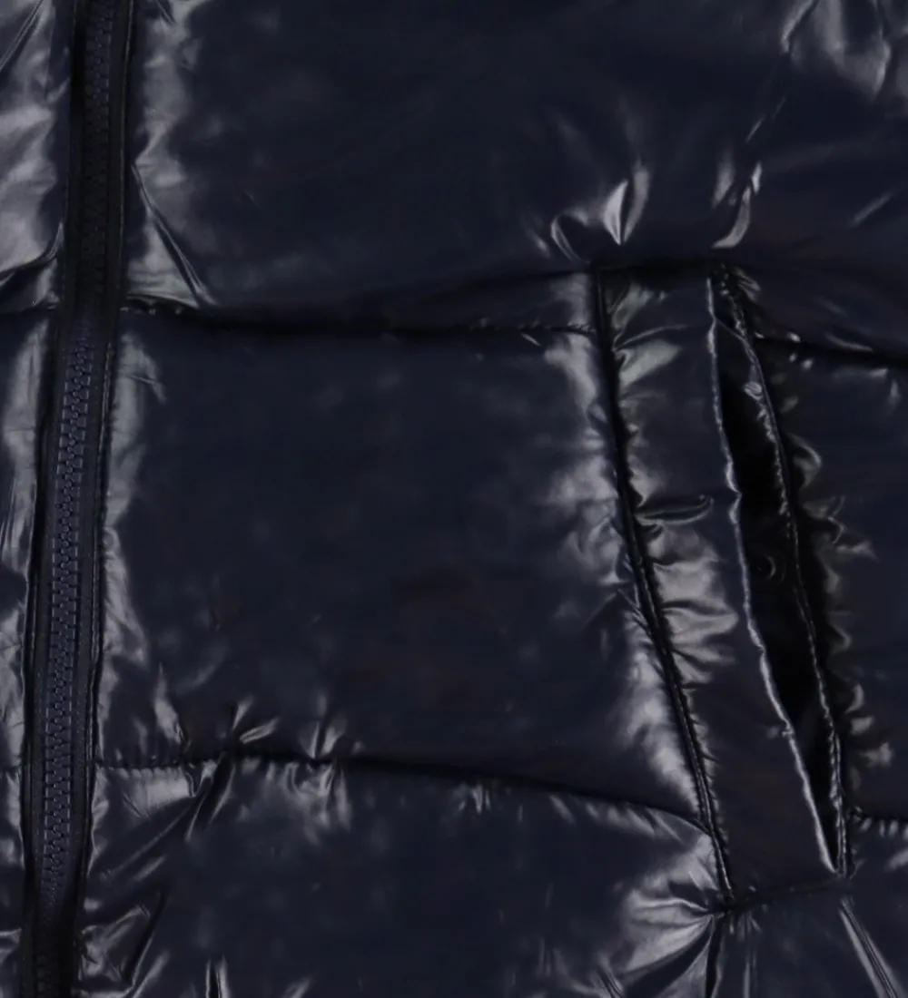 Elegant Grunt dynejakke i en blank, navy farve. De vandrette syninger tilføjer ekstra visuel dybde, som fremhæver stoffets struktur.