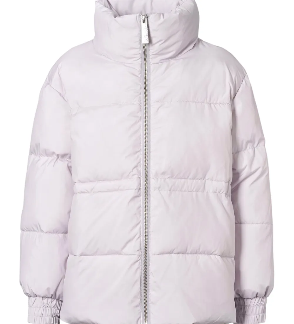 Fin Molo dynejakke i helt lys lilla med vandrette syninger og et stort enhjørningeprint på ryggen.