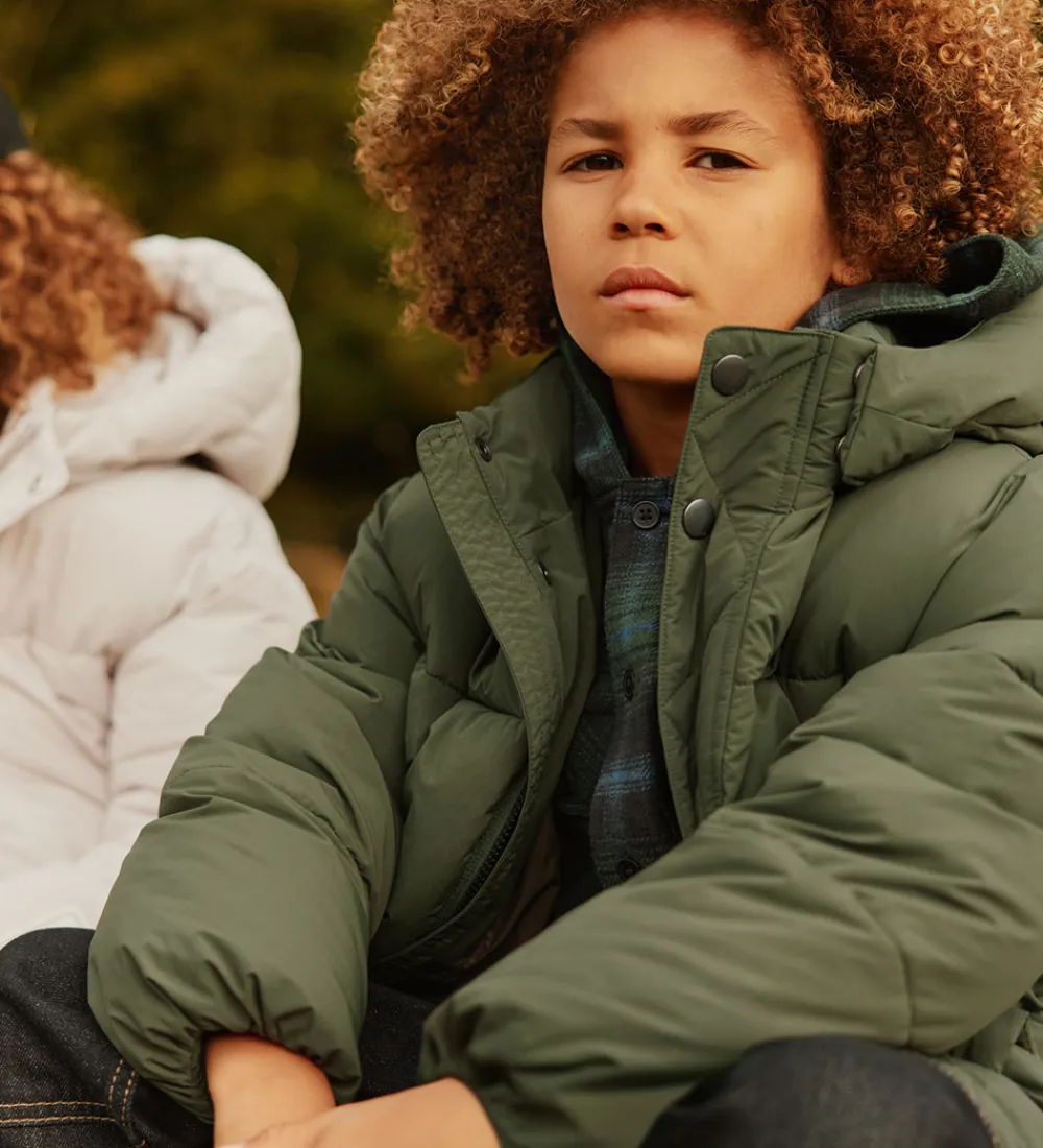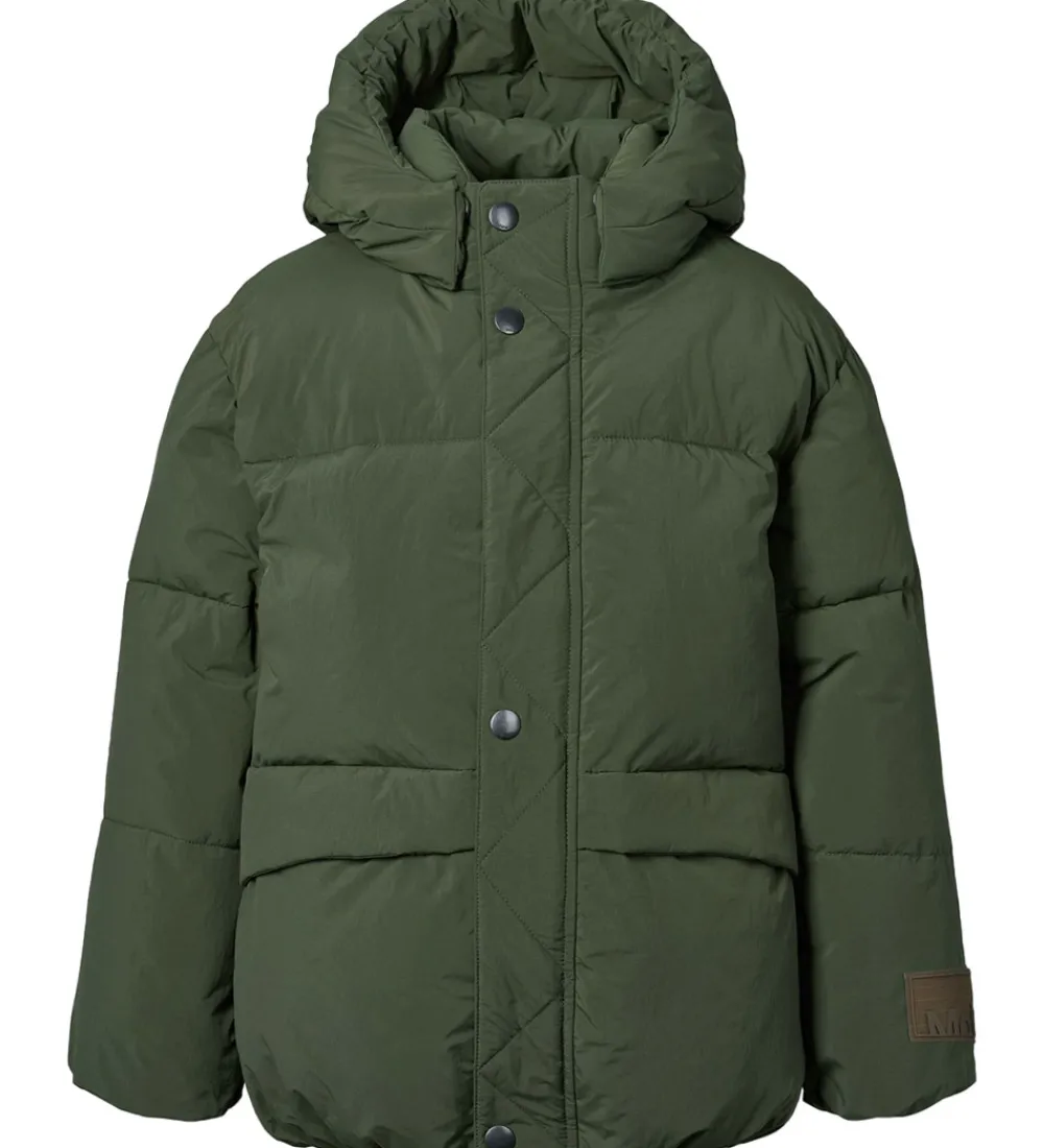 Fin Molo dynejakke i mørkegrøn med vandrette syninger.