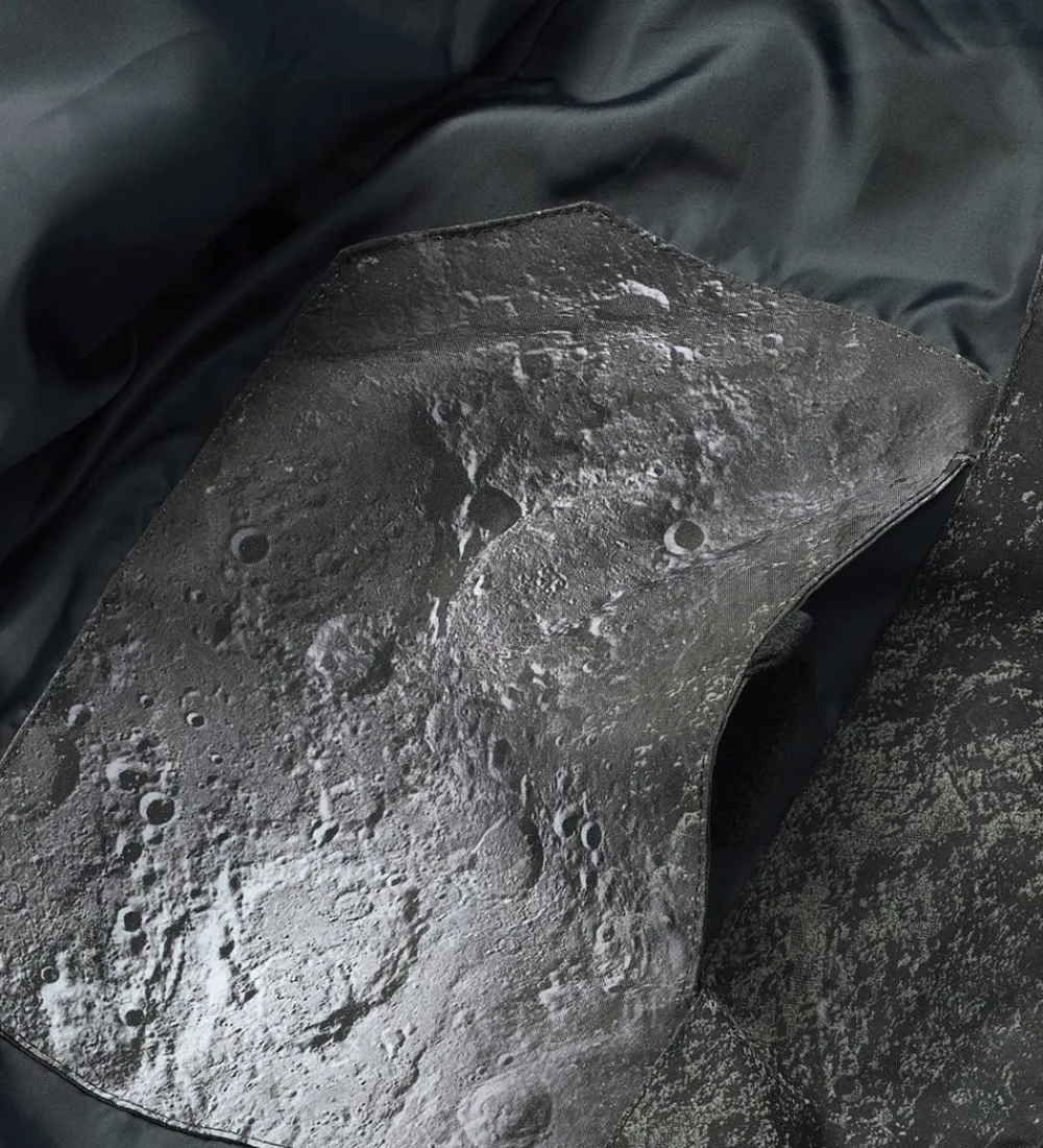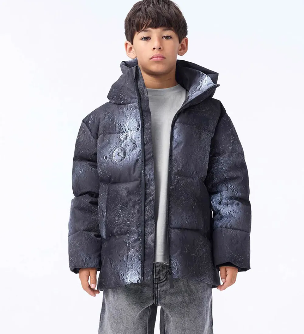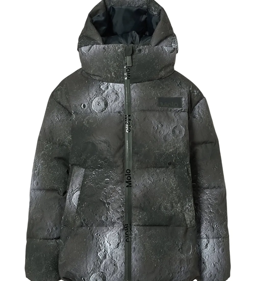 Smart Molo dynejakke med et mørkt allovermåneprint. Dynejakken har vandrette syninger og en diskret indvævet struktur i stoffet samt et logo på venstre bryst. Nederst på ryggen er der en logorefleks.