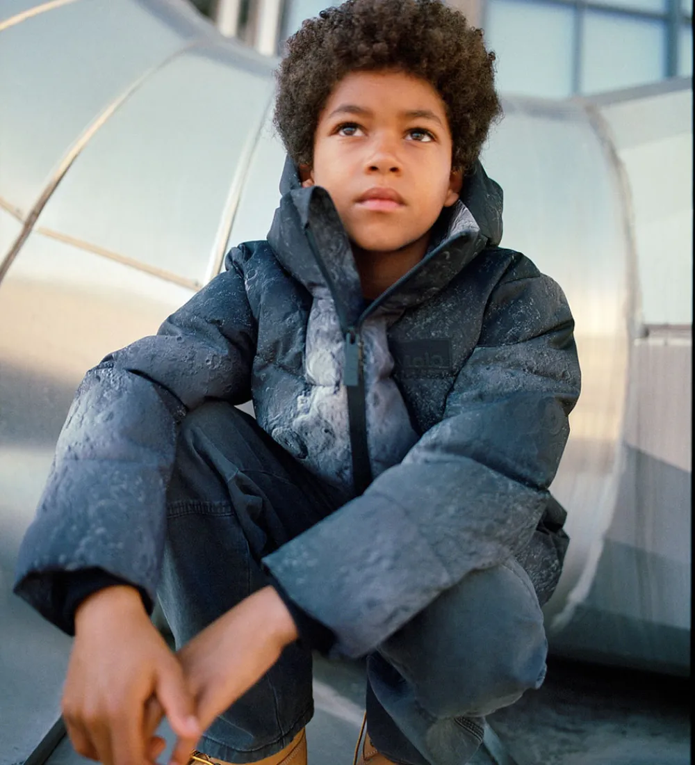 Molo dynejakken har en aftagelig hætte, der fæstnes med velcro langs indersiden af den høje halskrave. Dynejakken åbnes ved hjælp af en lynlås med indvendig vindstolpe og hagebeskytter.