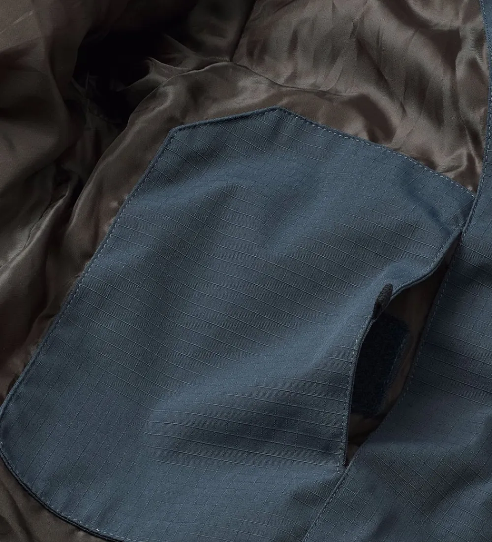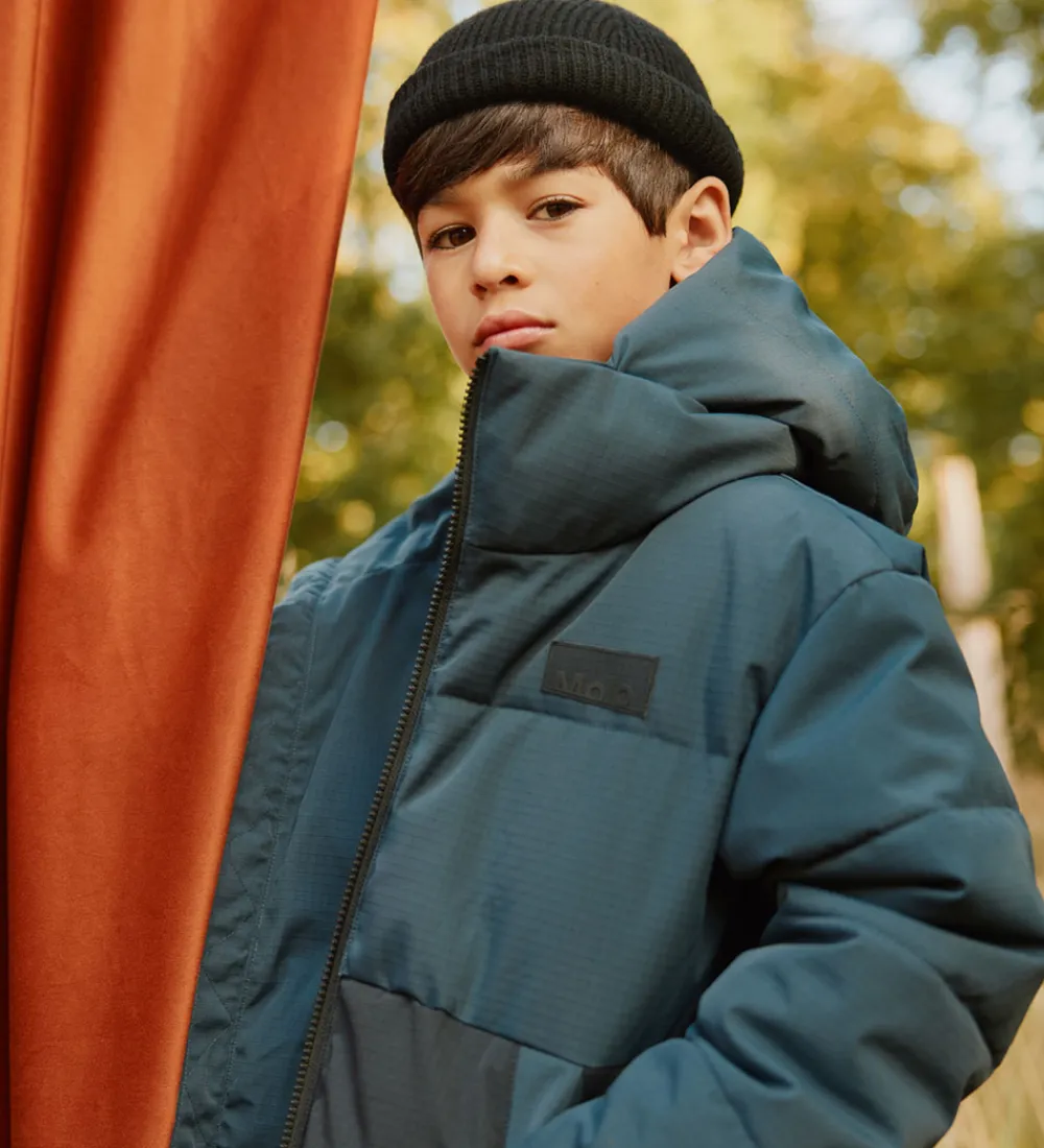 Molo dynejakken har en aftagelig hætte, der fæstnes med velcro langs indersiden af den høje halskrave. Dynejakken åbnes ved hjælp af en lynlås med indvendig vindstolpe og hagebeskytter.