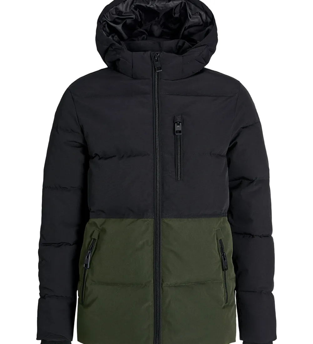 Stilren Jack & Jones dynejakke i mørkegrøn og sort. Dynejakkens struktur omfatter vandrette syninger, der giver et moderne udtryk.
