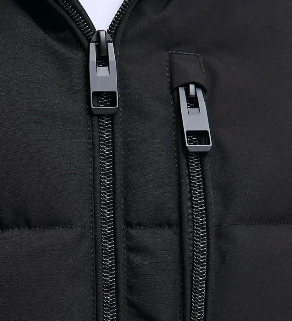 Dynejakken har en aftagelig hætte og lange ærmer. Foran ses en funktionel lynlås, som fortsætter op i en høj hals.