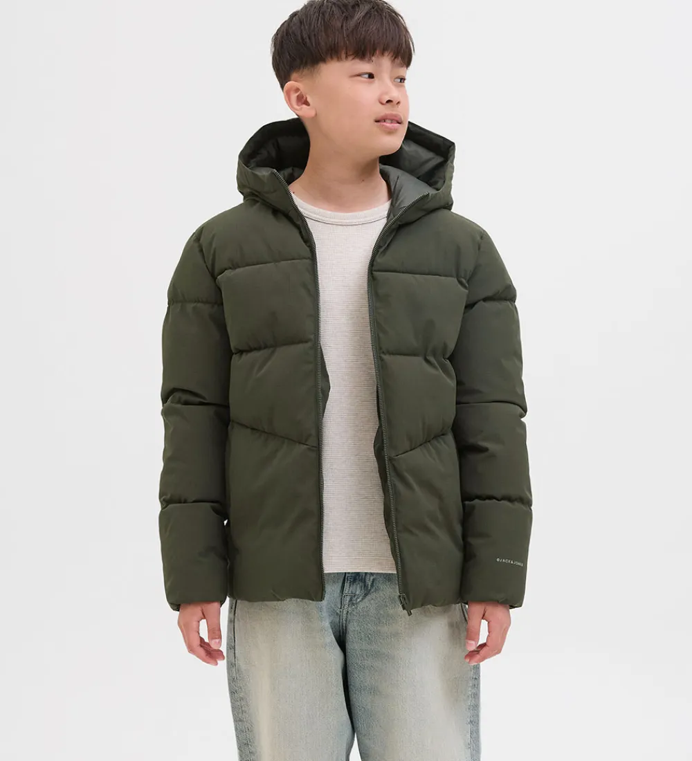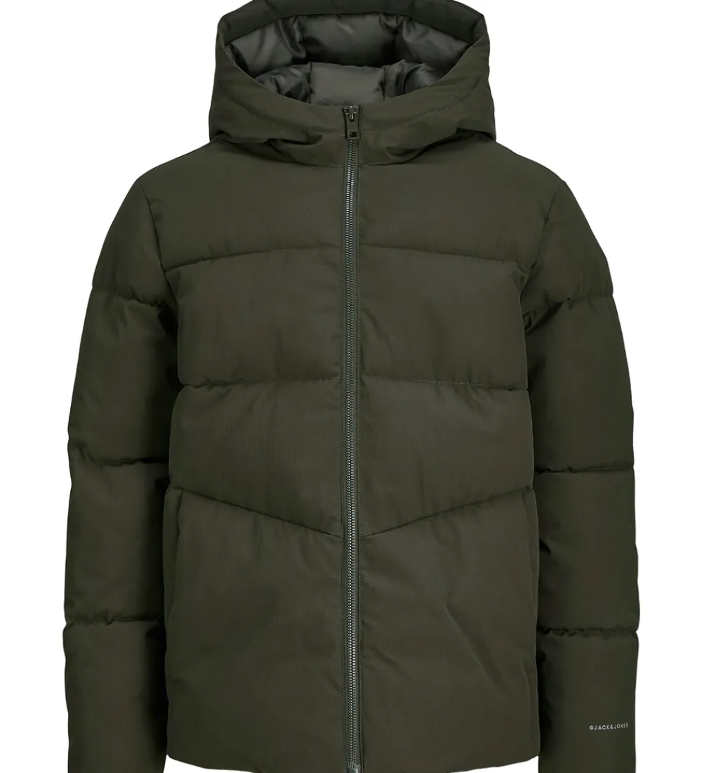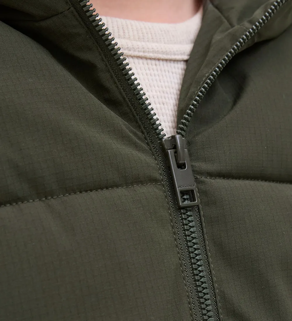 Lækker Jack & Jones dynejakke i en mørk, grøn nuance med vandrette syninger.