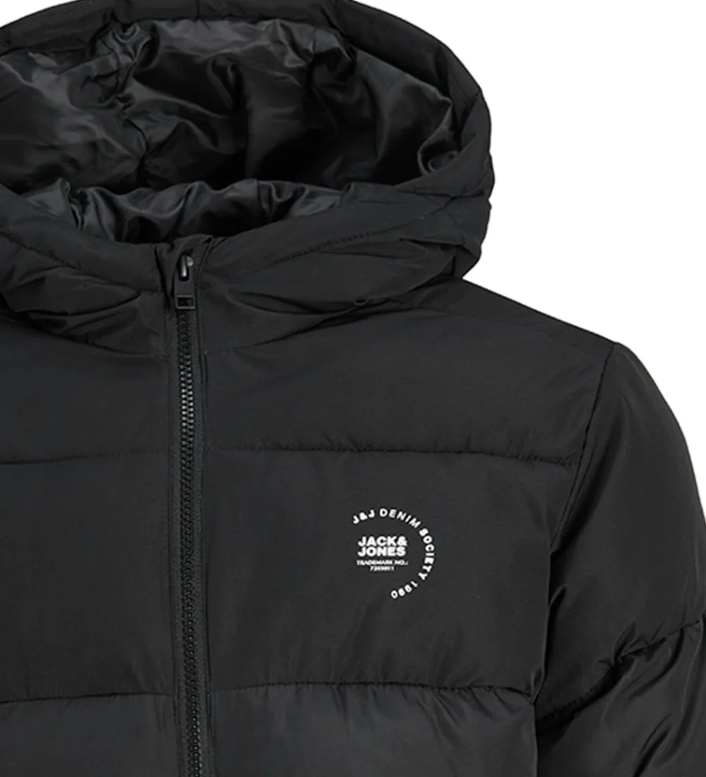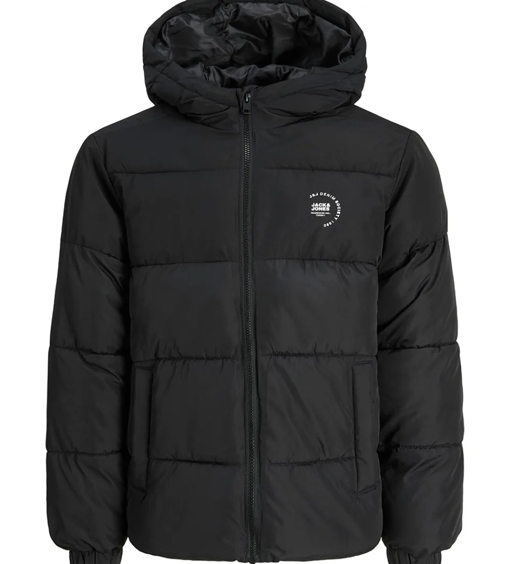 Flot Jack & Jones dynejakke i sort med vandrette syninger og et hvidt logoprint på venstre bryst.