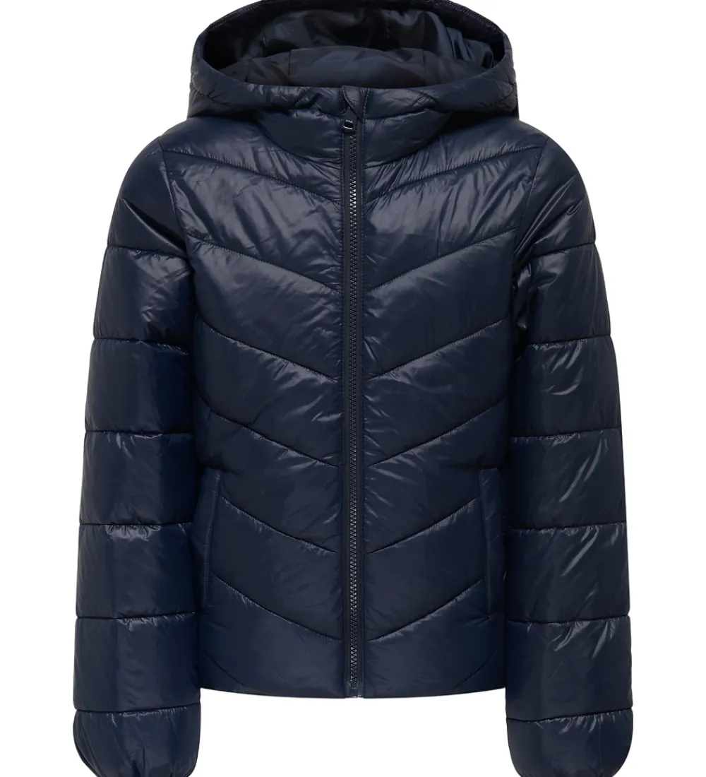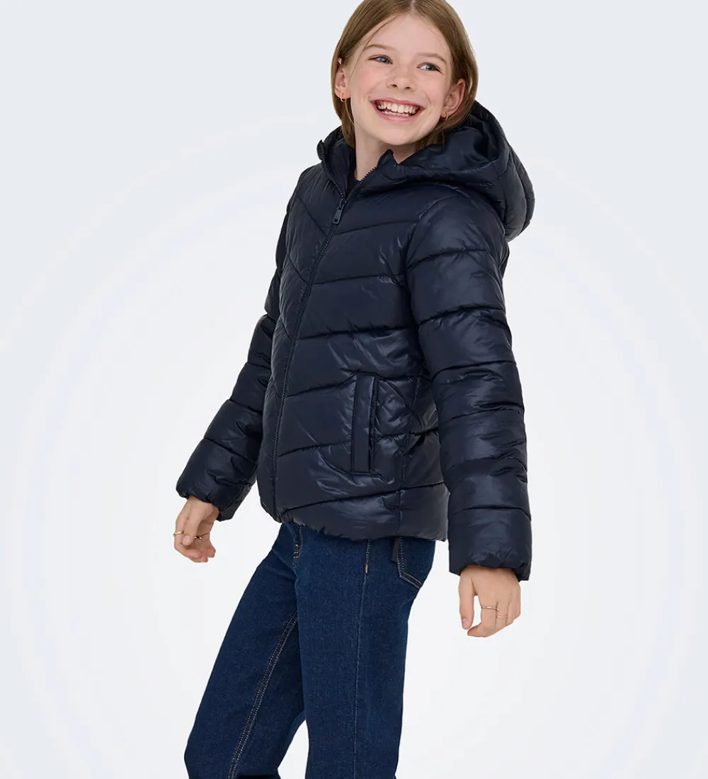Dejlig Kids Only dynejakke i navyblå med en smule skinnende overflade. Dynejakken er i en glatvævet kvalitet og med skrå syninger.