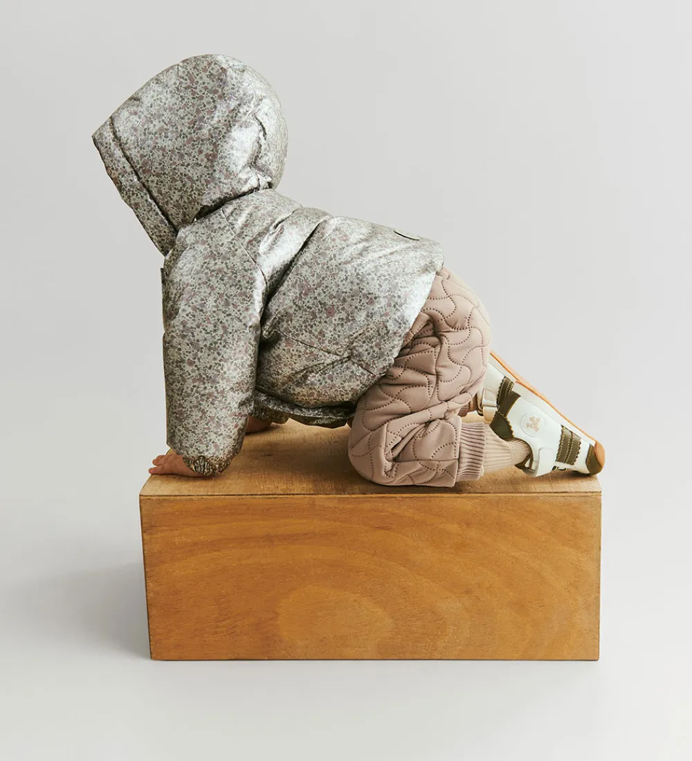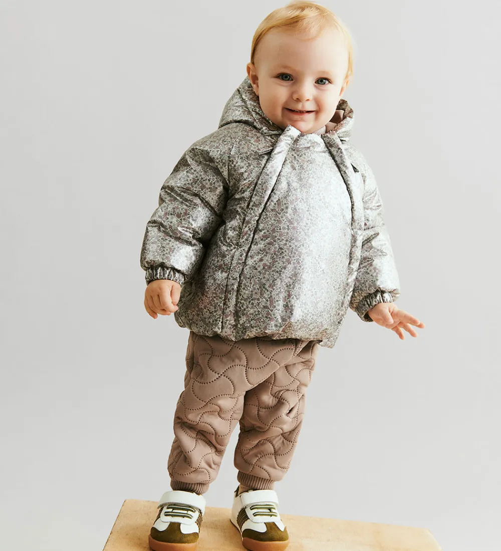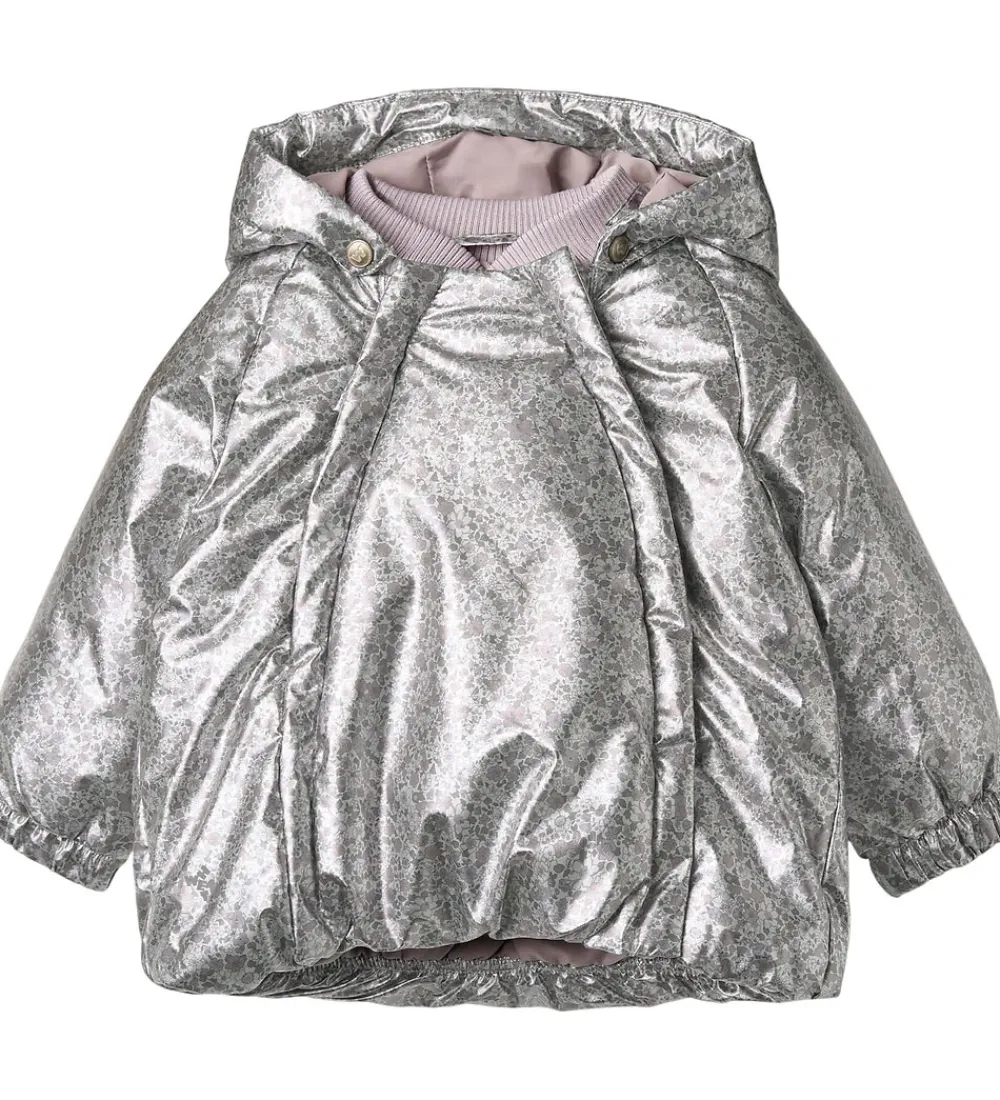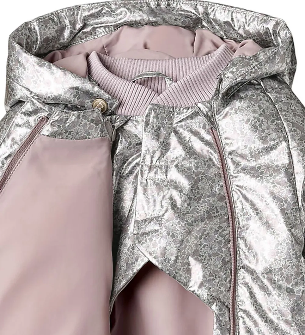 Lækker Wheat dynejakke i en skinnende sølvfarve med et alloverblomsterprint i støvet lilla, rosa og grønne farver.