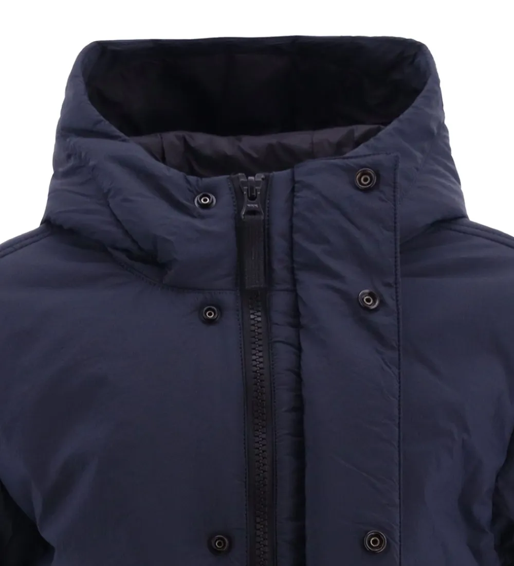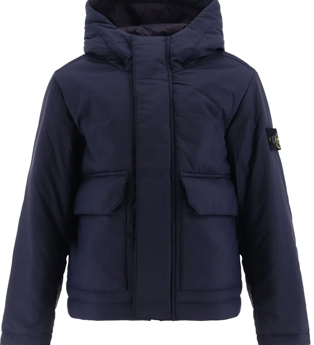 Flot Stone Island dynejakke i ensfarvet navy, og øverst på venstre ærme sidder det ikoniske logomærke fast med knapper.