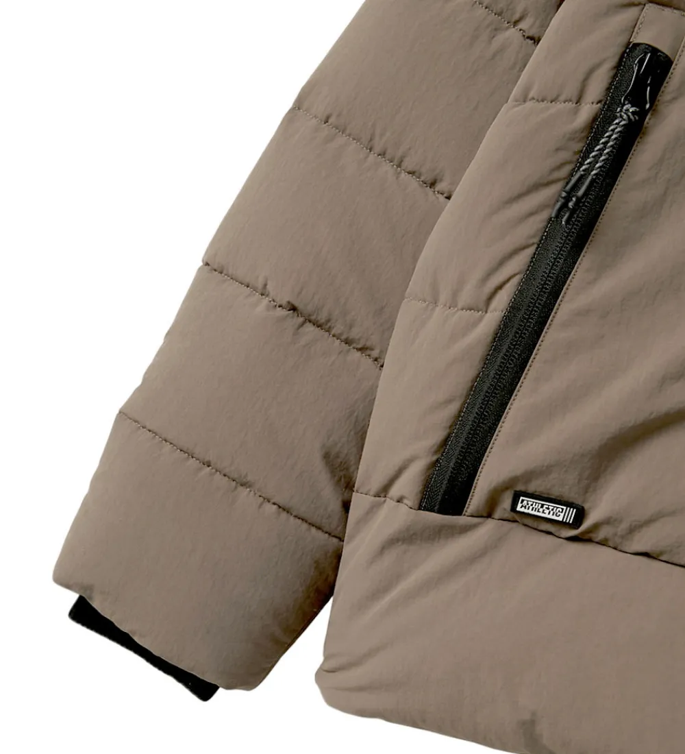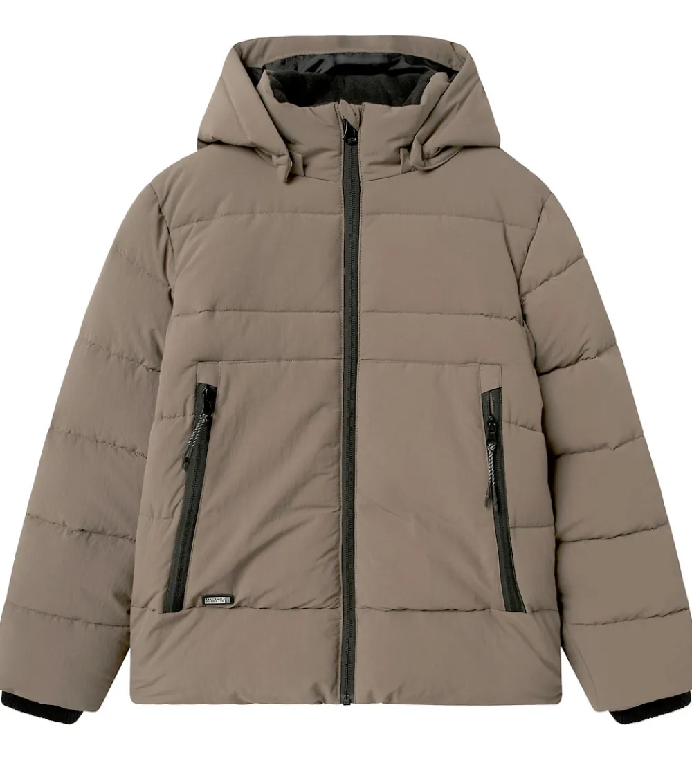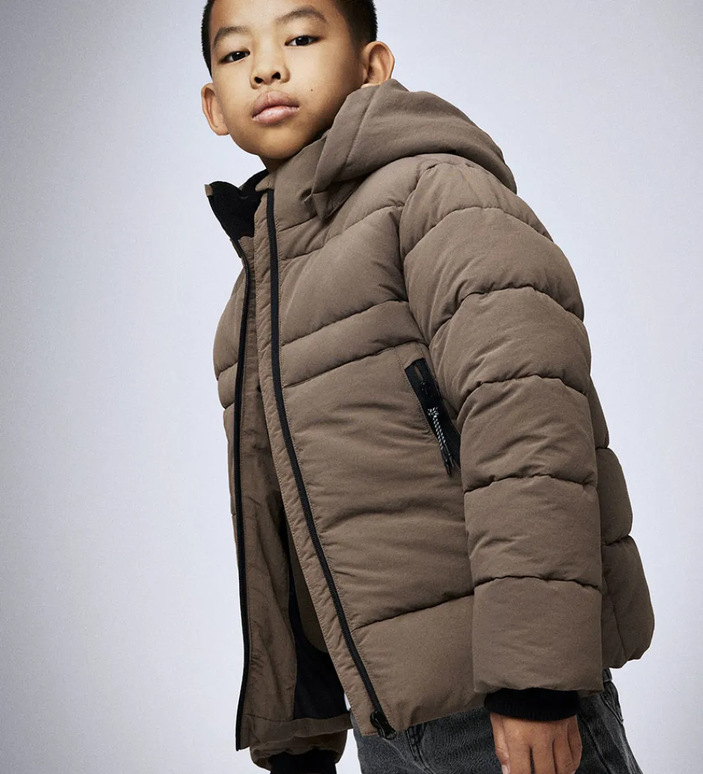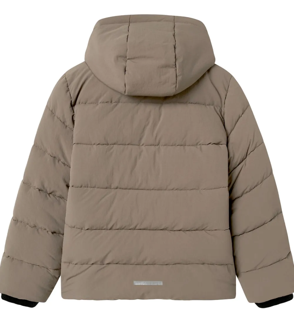 Stilren Name It dynejakke i en flot beige nuance. Dynejakken er designet med et enkelt og moderne look, der inkluderer en aftagelig hætte samt lange ærmer med behagelige ribkanter i sort.