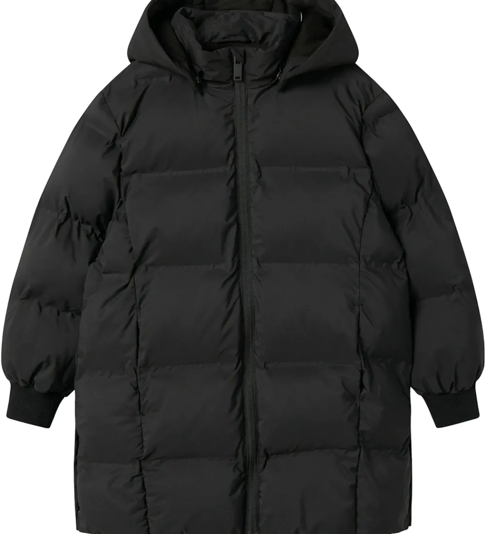 Fin Name It dynejakke i sort med en praktisk refleks nederst på ryggen.