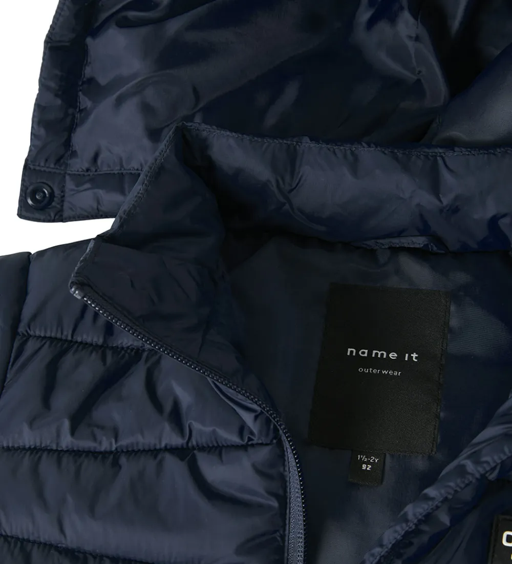 Stilfuld Name It dynejakke i dyb navy med et diskret firkantet logo på venstre bryst. Dynejakken har vandrette syninger, der skaber en ensartet overflade.