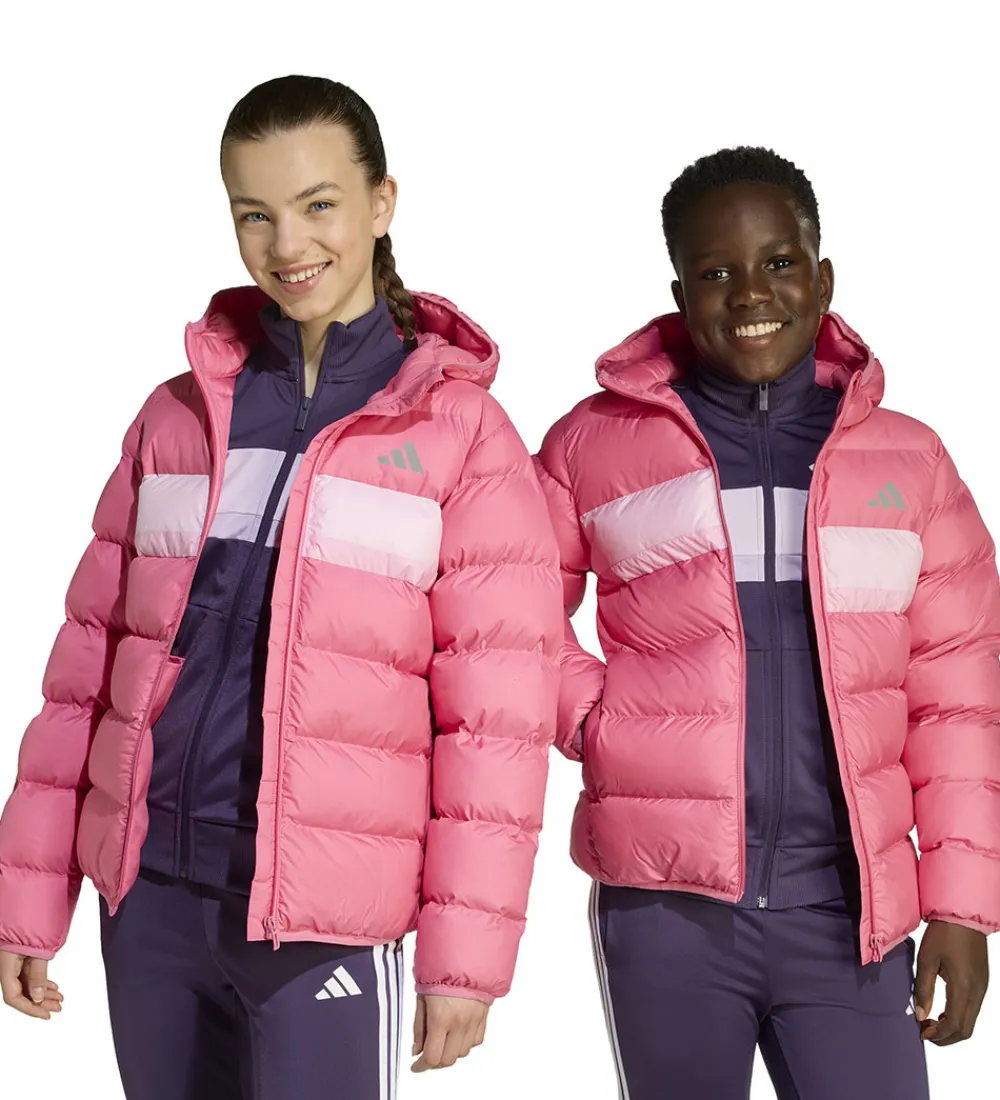 Flot adidas Performance dynejakke i en frisk pink farve med en kontraststribe i en lysere nuance over brystet. Fortil og nederst på ryggen er der et praktisk refleksprint.