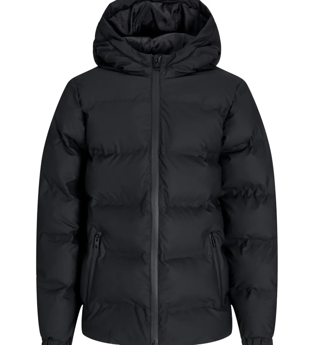 Smart Jack & Jones dynejakke i sort. Dynejakken har en fastsyet hætte og gennemgående lynlås fortil med hagebeskytter. Den har lange ærmer med elastik ved håndleddene. Fortil er der en lynlåslomme i hver side, og indvendigt er der blankt, glatvævet for.