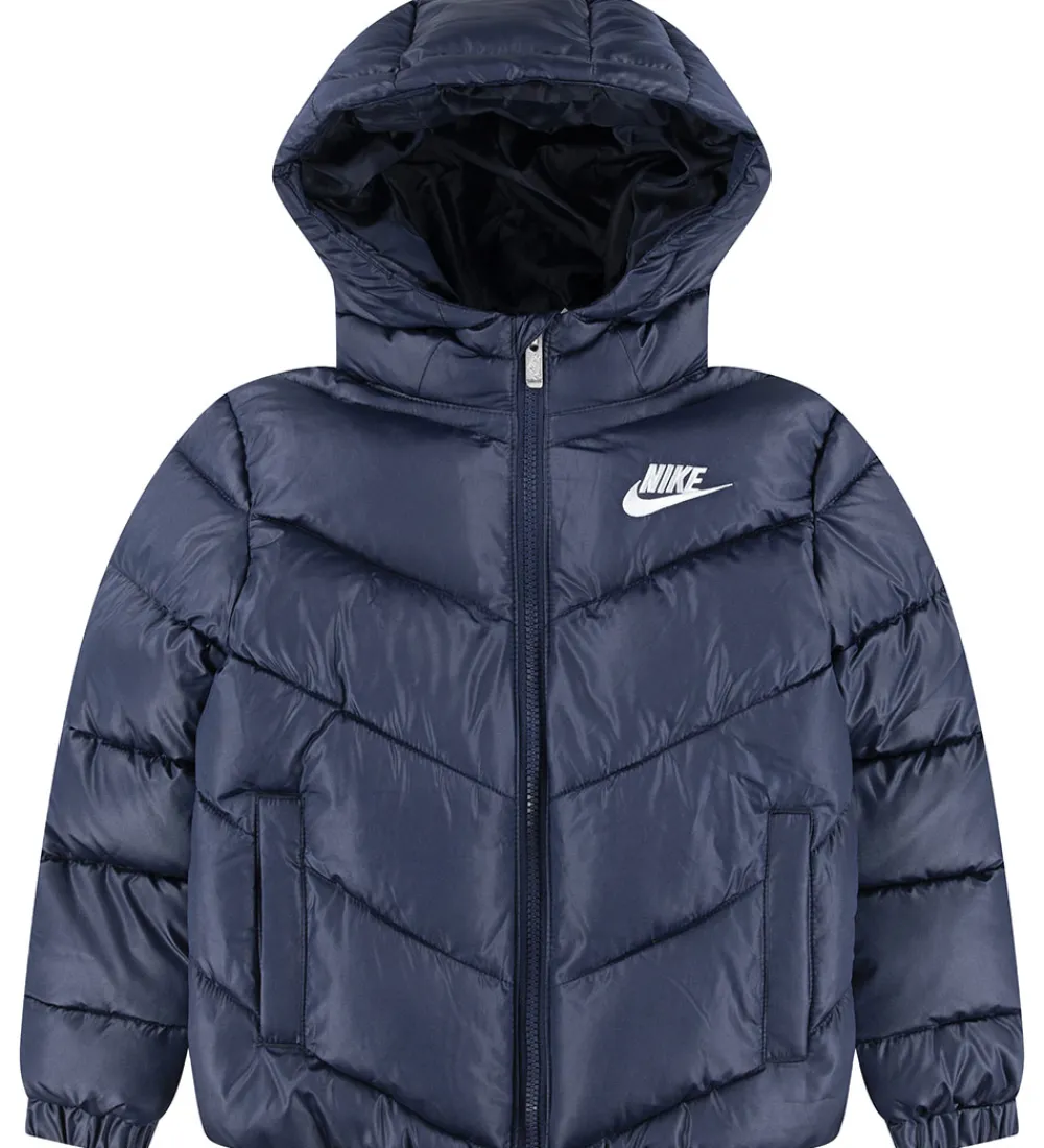 Lækker Nike dynejakke i navyblå med et broderet, hvidt logo på venstre bryst og skrå syninger.