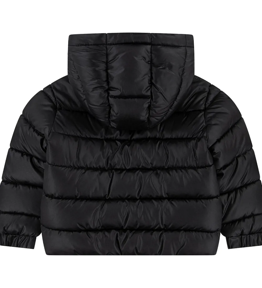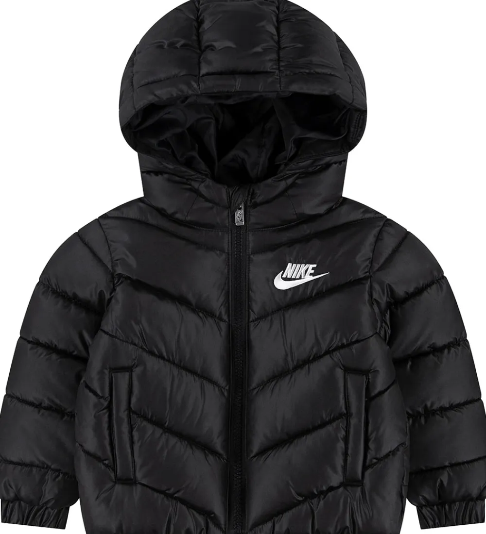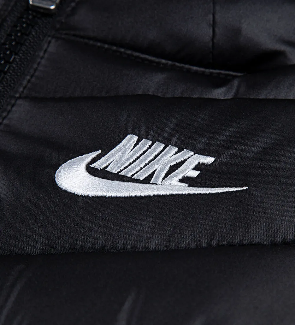 Lækker Nike dynejakke i sort med et broderet, hvidt logo på venstre bryst og skrå syninger.