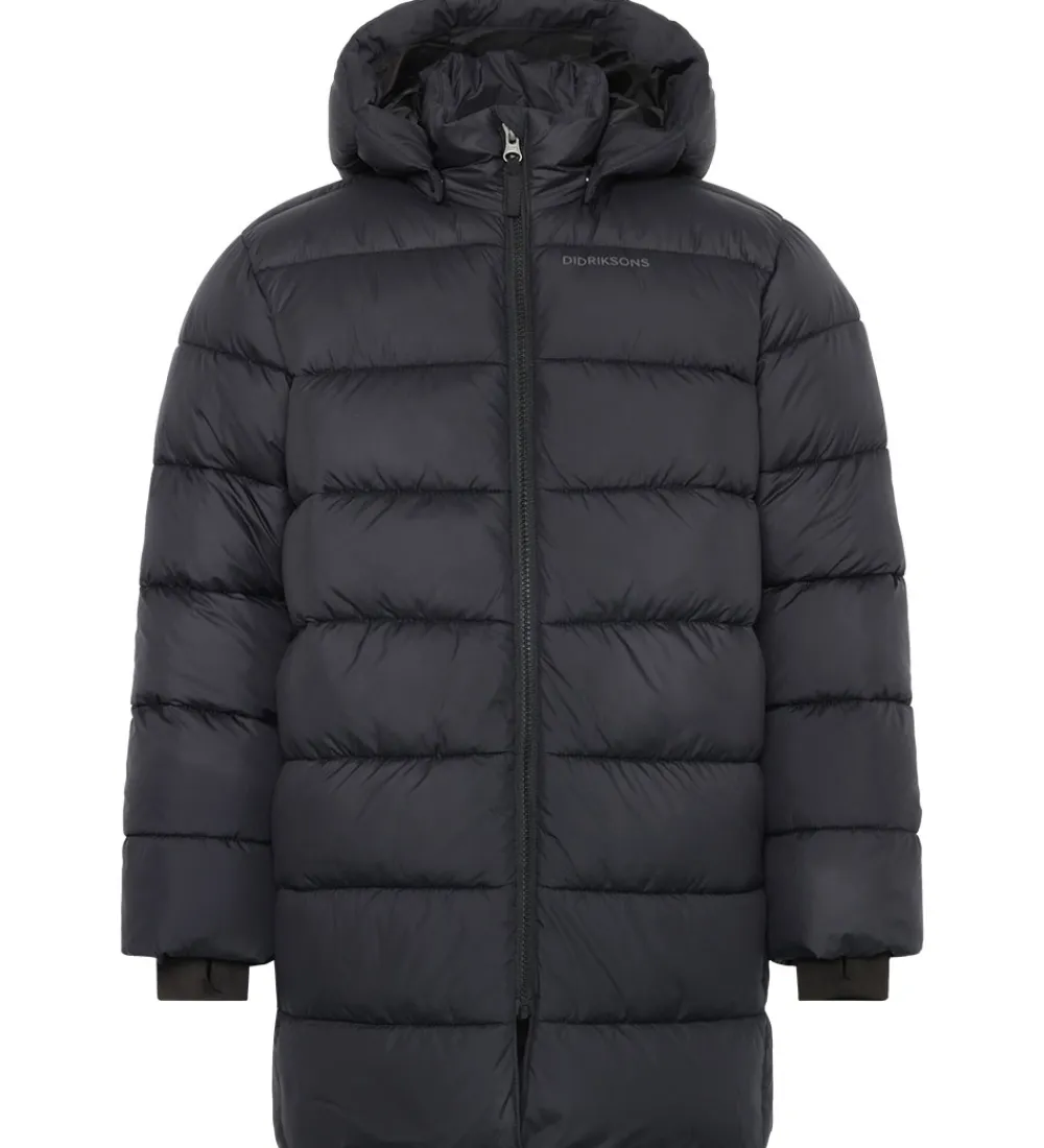 Skøn Didriksons dynejakke i sort med vandrette syninger og diskrete logoprint.