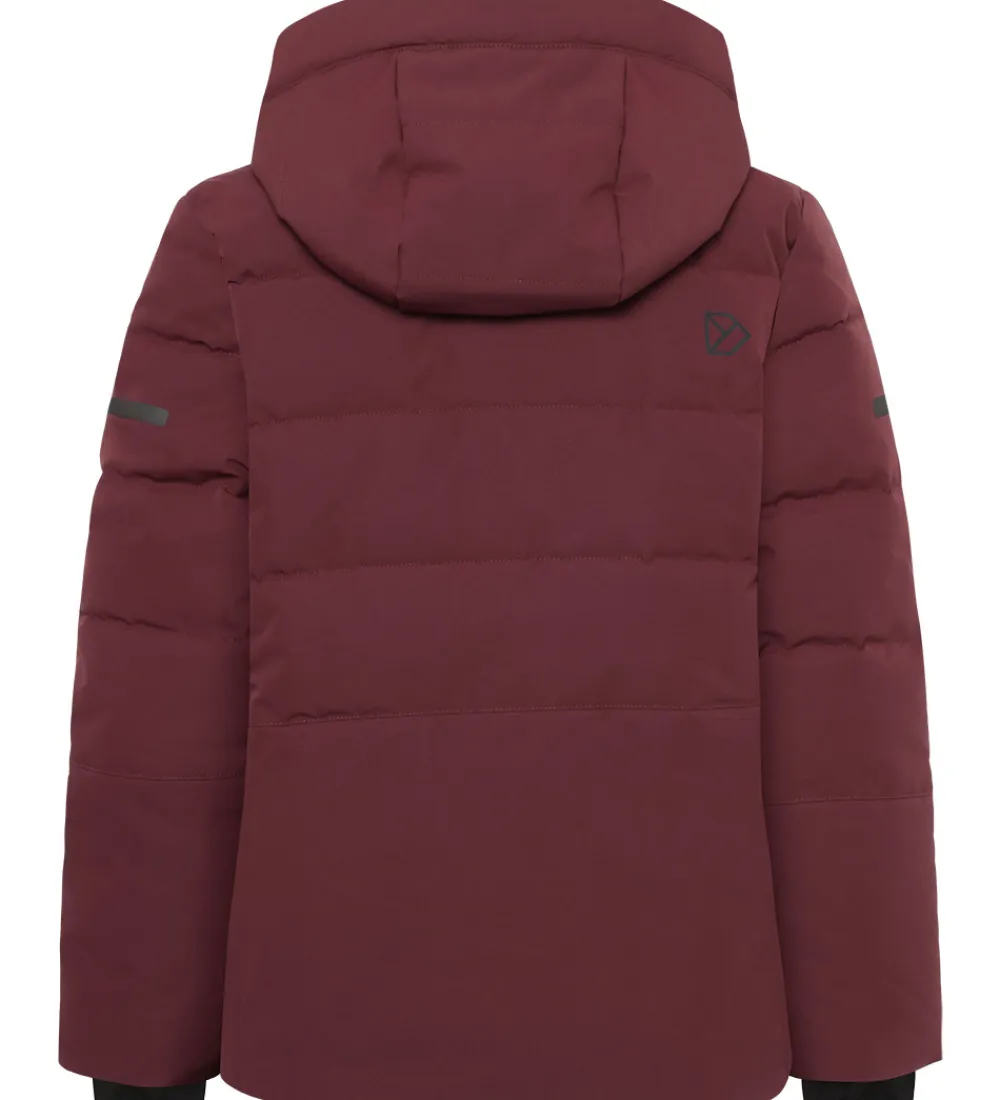 Skøn Didriksons dynejakke i en flot, mørkerød nuance med vandrette syninger og en sort logoapplikation på brystet samt velplacerede reflekser.