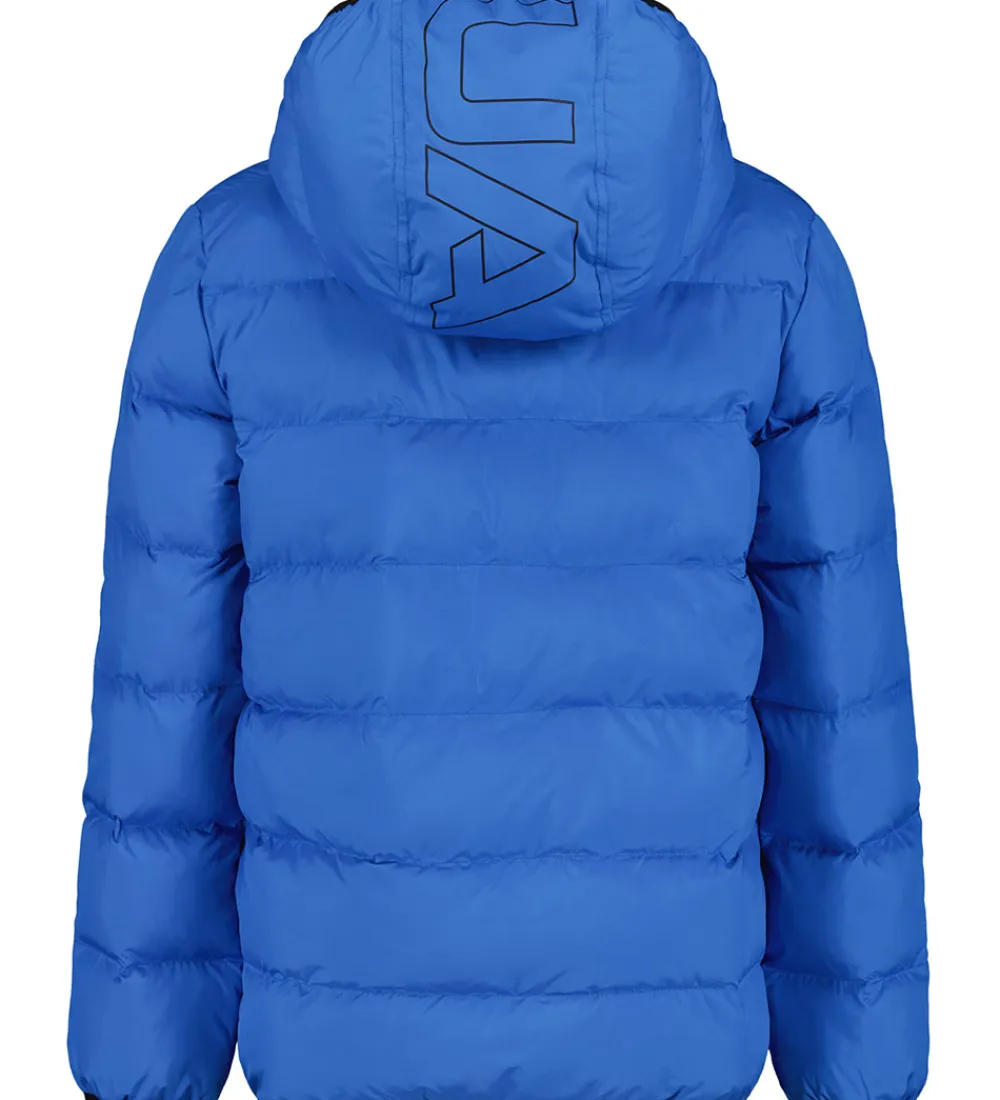 Flot Under Armour dynejakke i en klar blå farve med sort logo på venstre bryst og sorte kanter. På toppen af hætten er der et sort print med bogstaverne “UA”.
