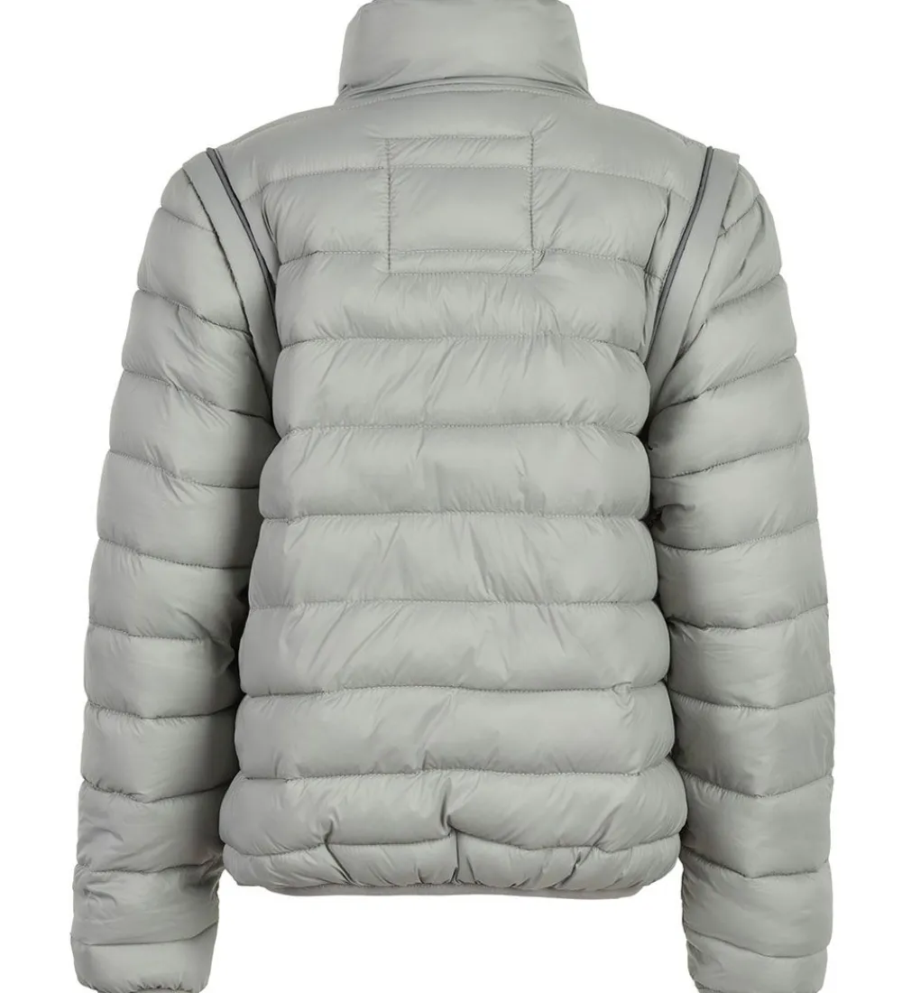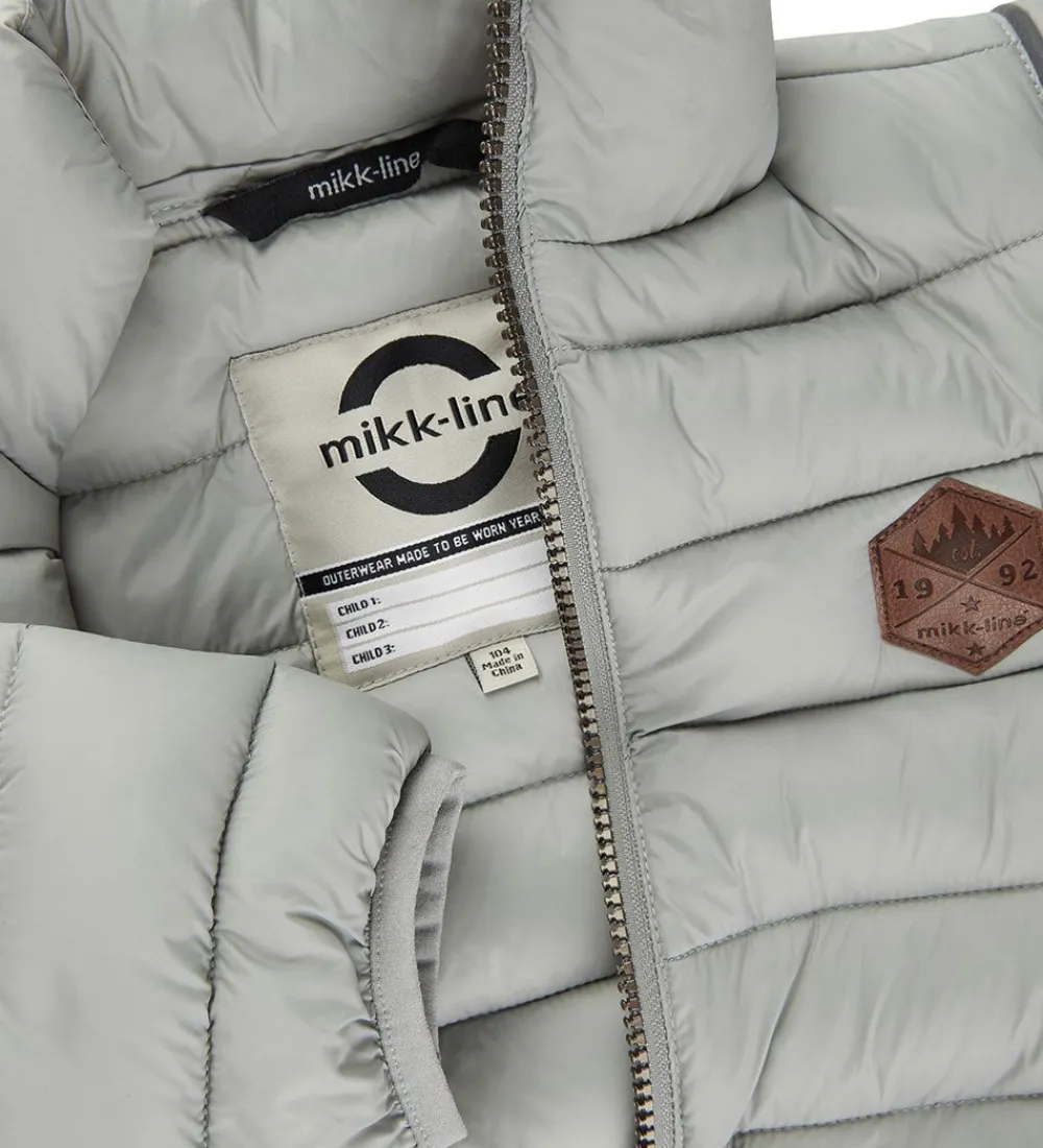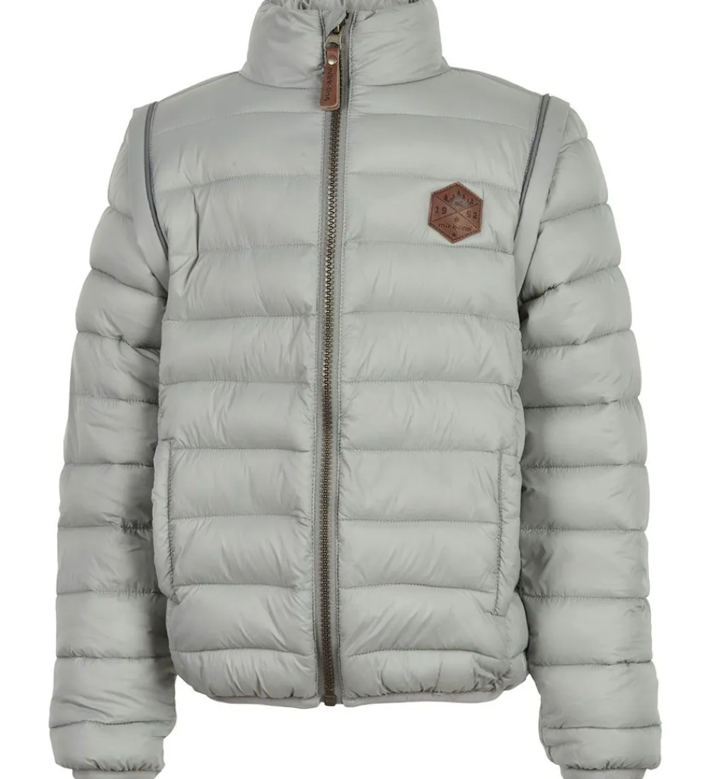 Lækker Mikk-Line dynejakke i ensfarvet grå med vandrette syninger. På venstre bryst er der en logoapplikation i brunt læderlook.