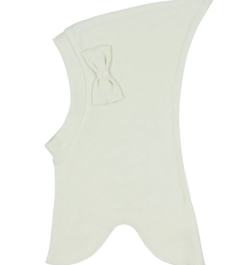 Sød Racing Kids elefanthue i cremehvid med en sløjfe på venstre side og en logoapplikation på toppen foran.