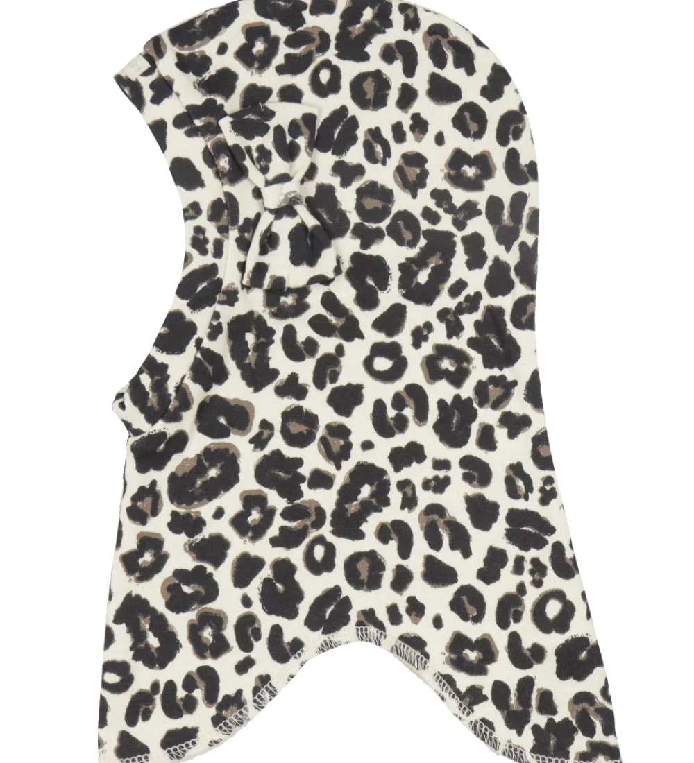 Sød Racing Kids elefanthue i cremehvid med sort og brunt leopardprint og en fin sløjfe på venstre side.
