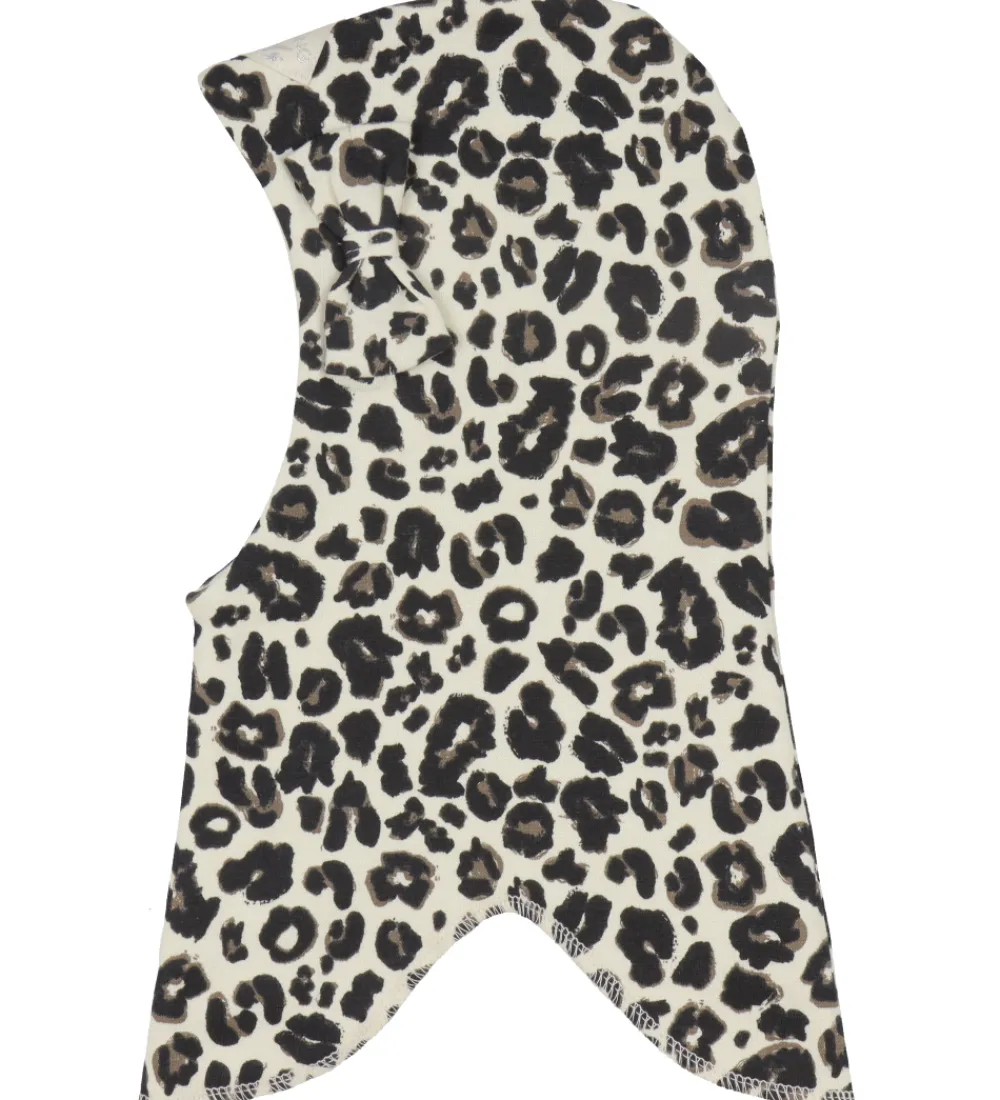 Flot Racing Kids elefanthue i cremehvid med sort og brunt leopardprint og en fin sløjfe på venstre side.