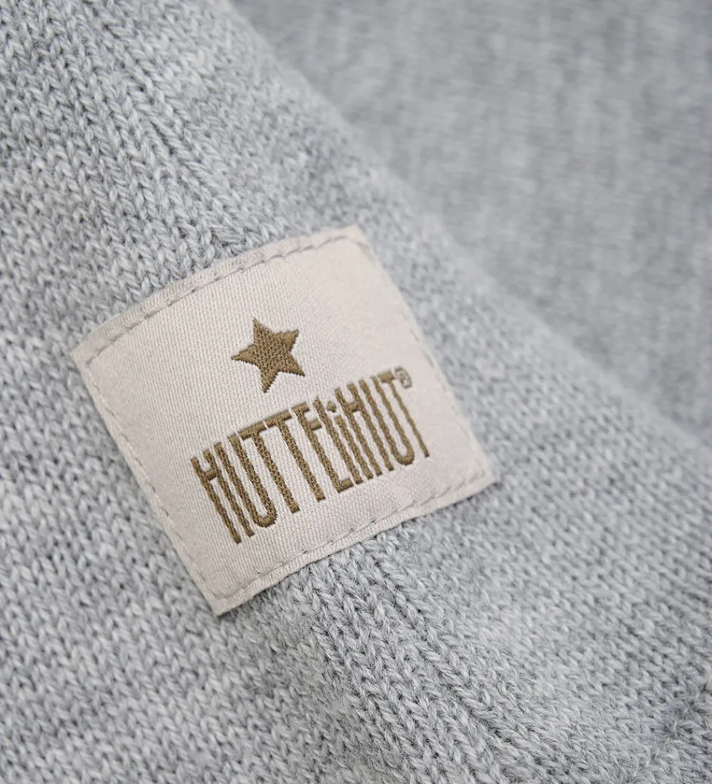 Elegant Huttelihut elefanthue strikket i en meleret lysegrå. Huttelihut elefanthuen består af to lag og har en spids hovedform, samt en split-effekt i bunden. Elefanthuen er fremstillet i en lækker blanding af merinould og bomuld.
