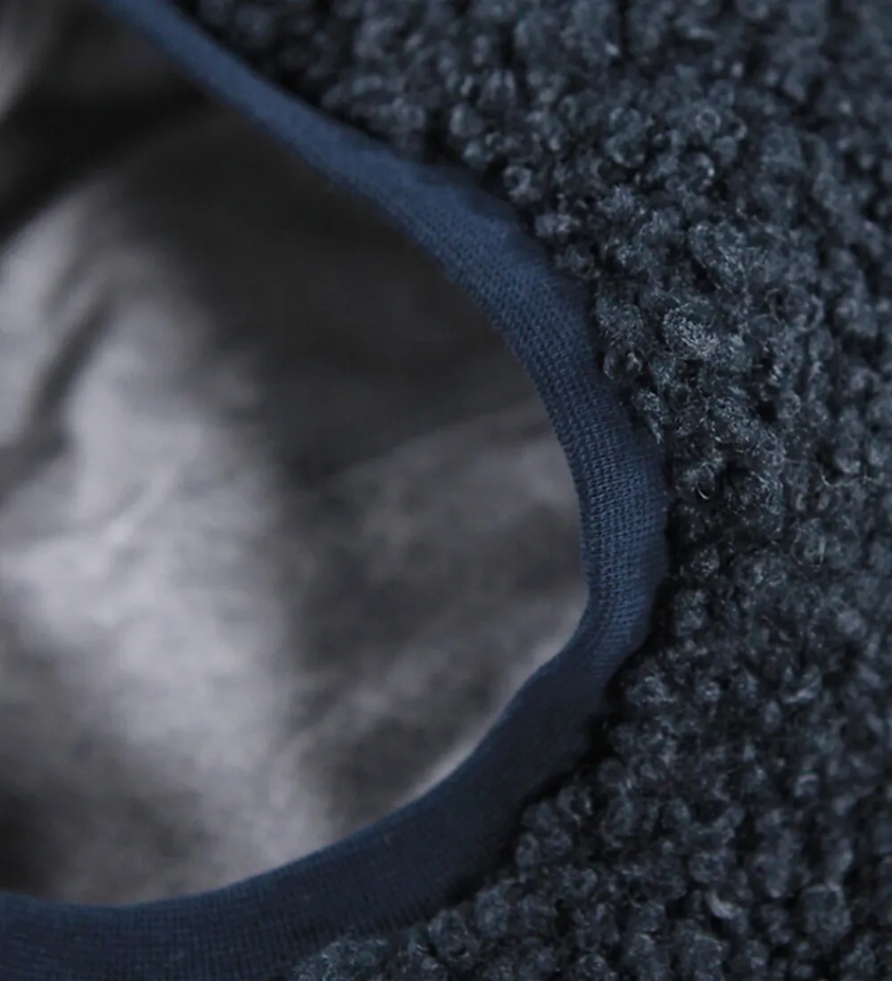 Flot Molo elefanthue i mørkeblå teddyfleece og med et gråmeleret for. Molo elefanthuen består af to lag og har en rund hovedform med små øre-detaljer på toppen.