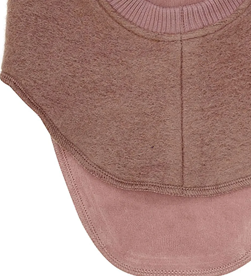 Elegant elefanthue fra Huttelihut i en mørkerosa nuance med en rund hovedform og to kvaste af alpakkapels på toppen. Elefanthuen er designet med to lag for ekstra isolering og har en ribkant i åbningen, der sikrer en god pasform.