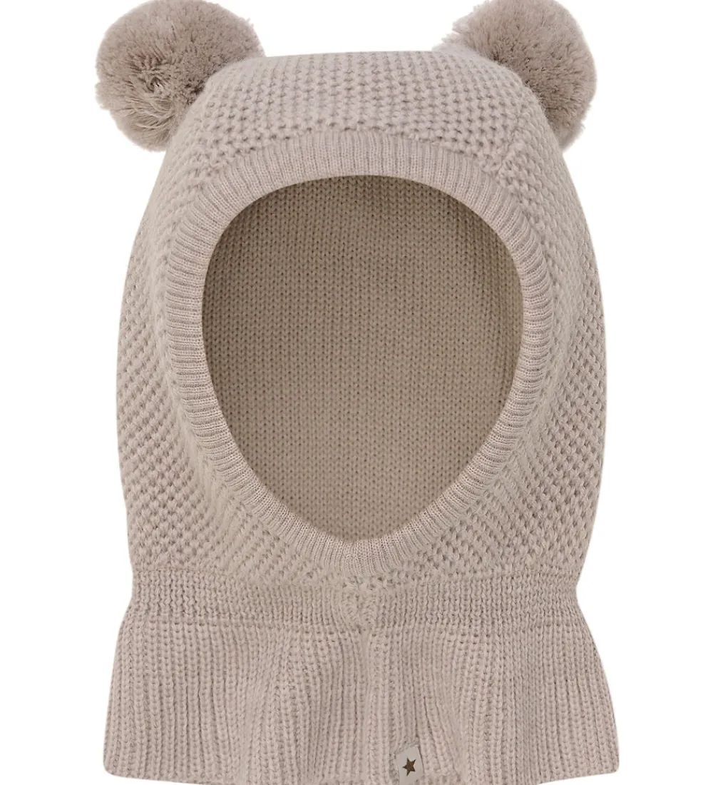 Huttelihut elefanthuen har en rund hovedform med en bred ribkant i ansigtsåbningen og rundt om halsen. Ved ørene er der et praktisk vindstop, som beskytter mod vinden. Elefanthuen er lavet af lunt merinould på ydersiden, mens foring er af bomuld.