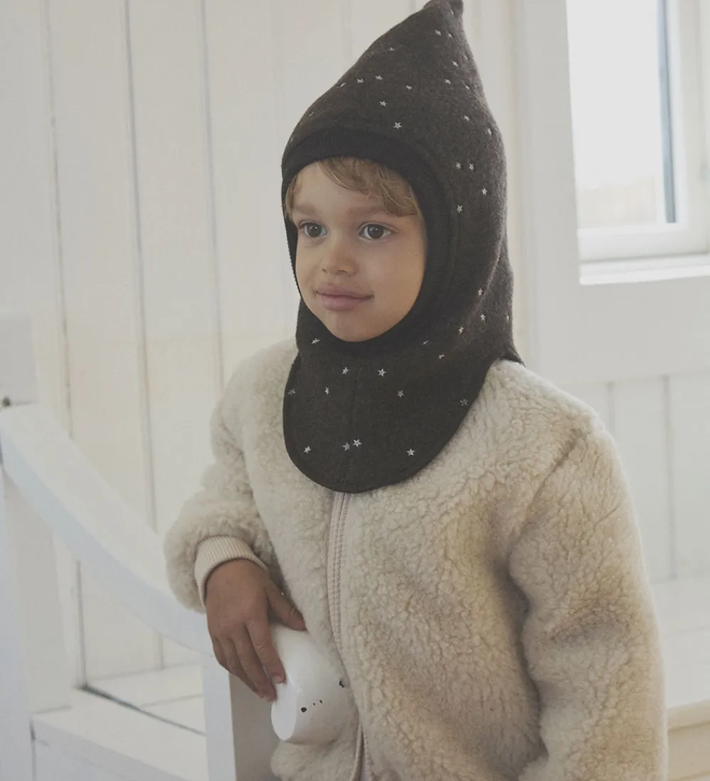 Praktisk Huttelihut elefanthue af lunt uldfleece i en meleret mørkebrun med hvide stjerner. Huttelihut elefanthuen består af to lag og har en spids hovedform med en split-effekt i bunden.