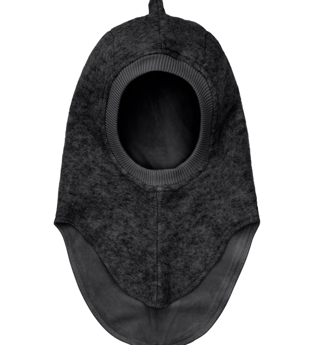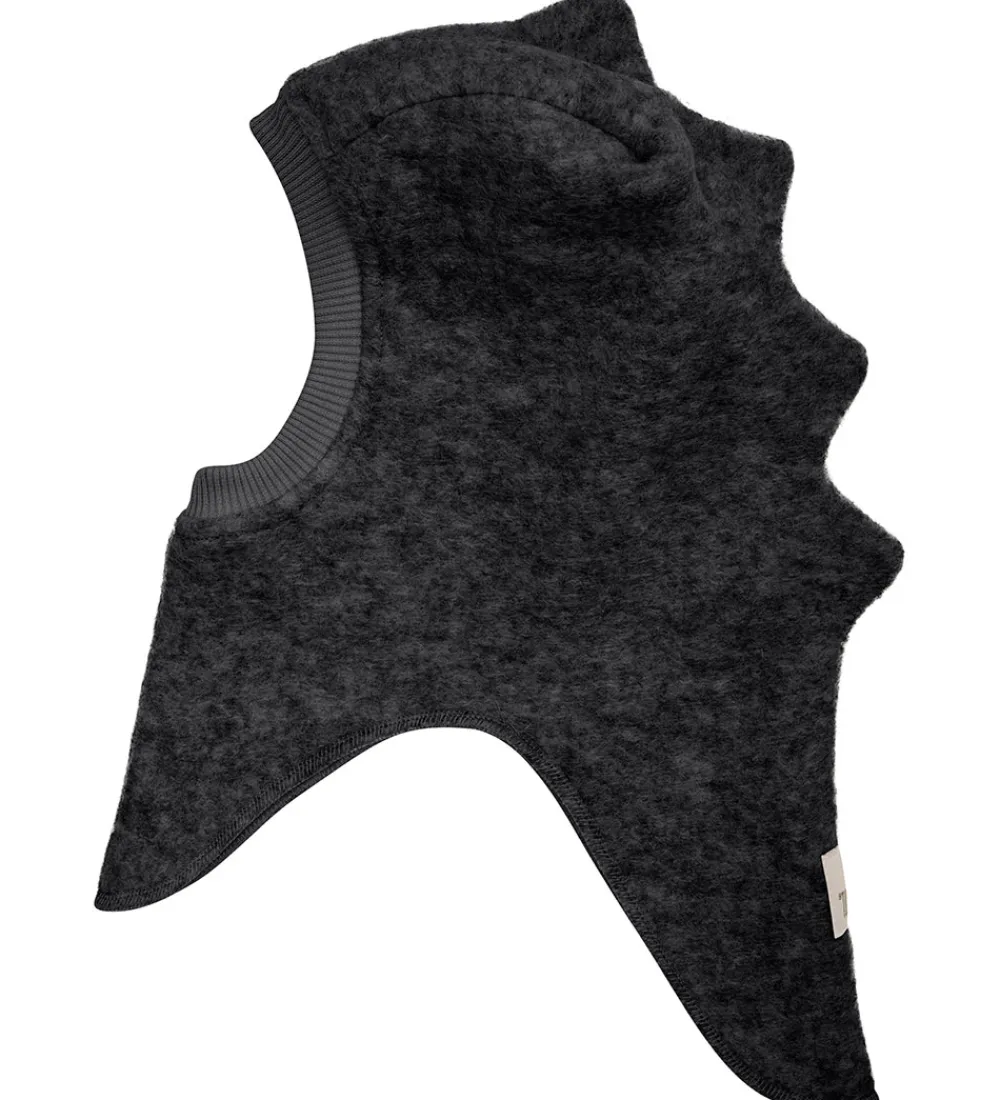 Imponerende Huttelihut elefanthue i en mørkegråmeleret med unikke takker langs kanten. Huttelihut elefanthuen består af to lag og har en rund hovedform med indsyet ribkant ved ansigtsåbningen.