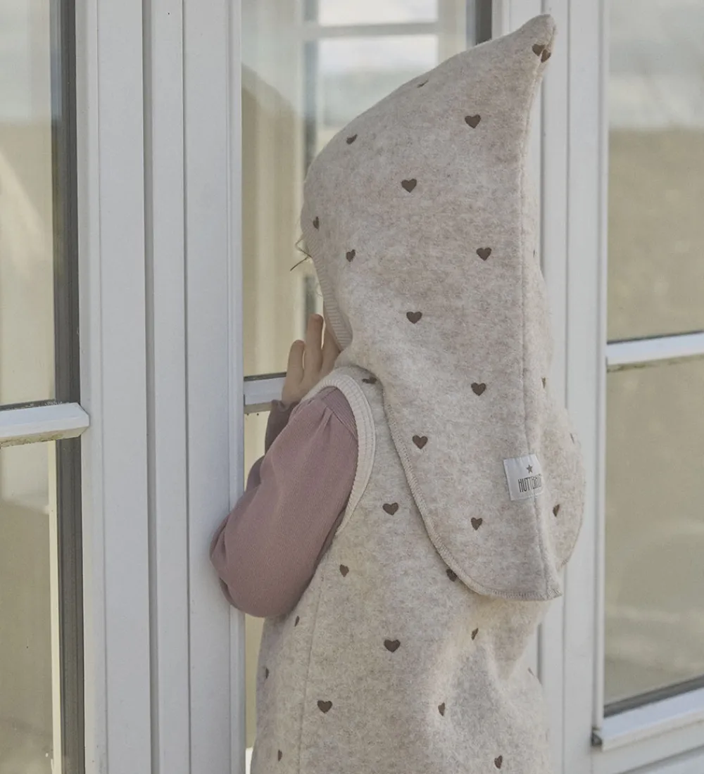 Charmerende Huttelihut elefanthue af lunt uldfleece i en meleret beige med små, brune hjerter. Huttelihut elefanthuen har en spids hovedform og består af to lag. Den har en rund åbning til ansigtet og en blød ribkant, der giver en god pasform.