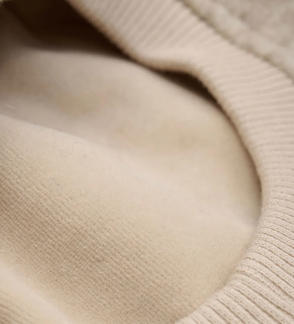 Huttelihut elefanthuen har en yderside af merinould og polyester samt en inderside af blødt velour.