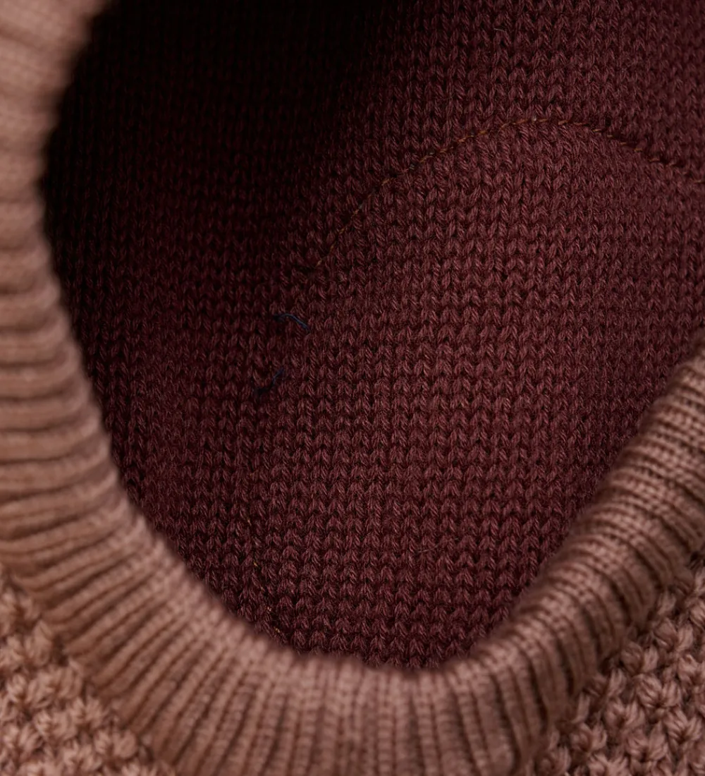 Huttelihut elefanthuen har en rund hovedform med en bred ribkant i ansigtsåbningen og rundt om halsen. Ved ørene er der et praktisk vindstop, som beskytter mod vinden. Elefanthuen er lavet af lunt merinould på ydersiden, mens foring er af bomuld.