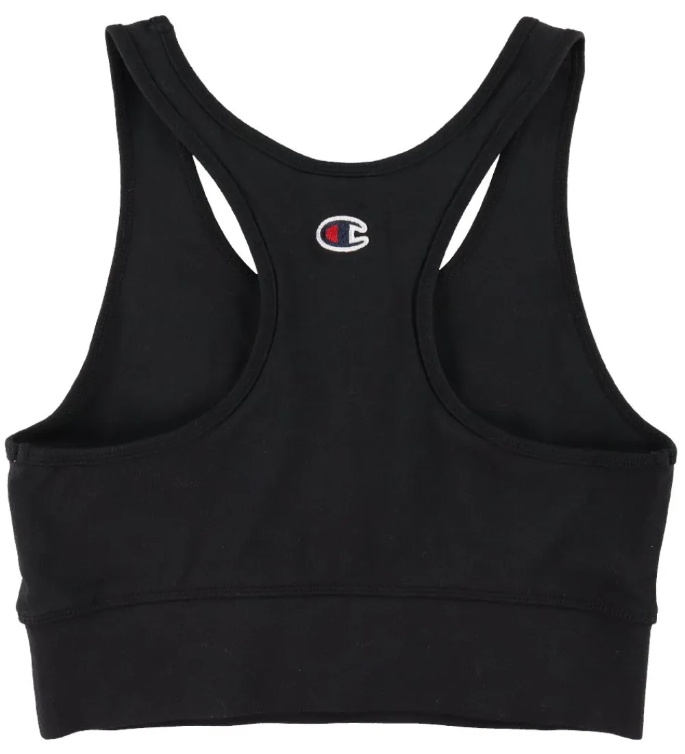 Flot Champion Fashion top i sort med et broderet logo i navy, rød og hvid i på ryggen.