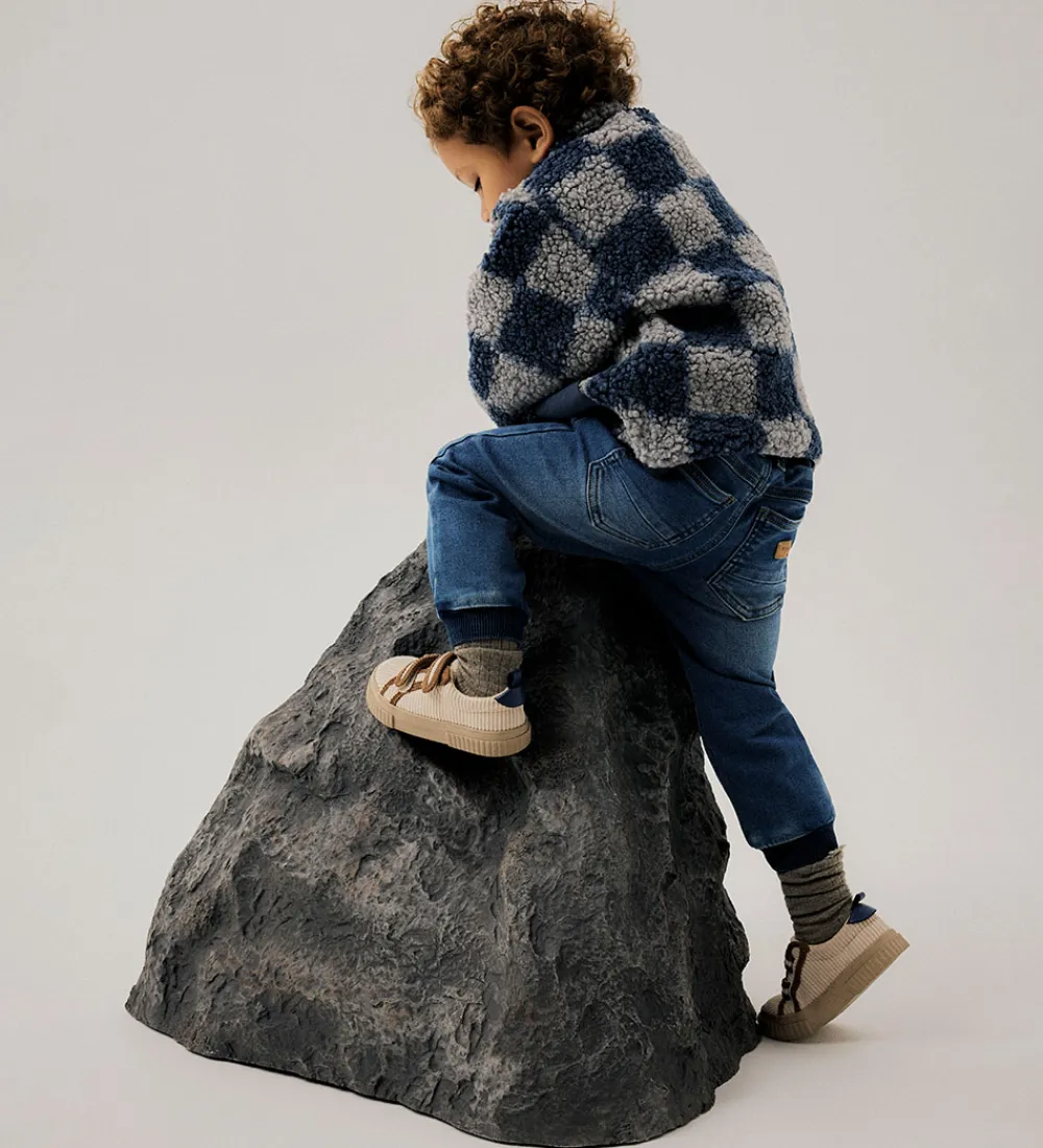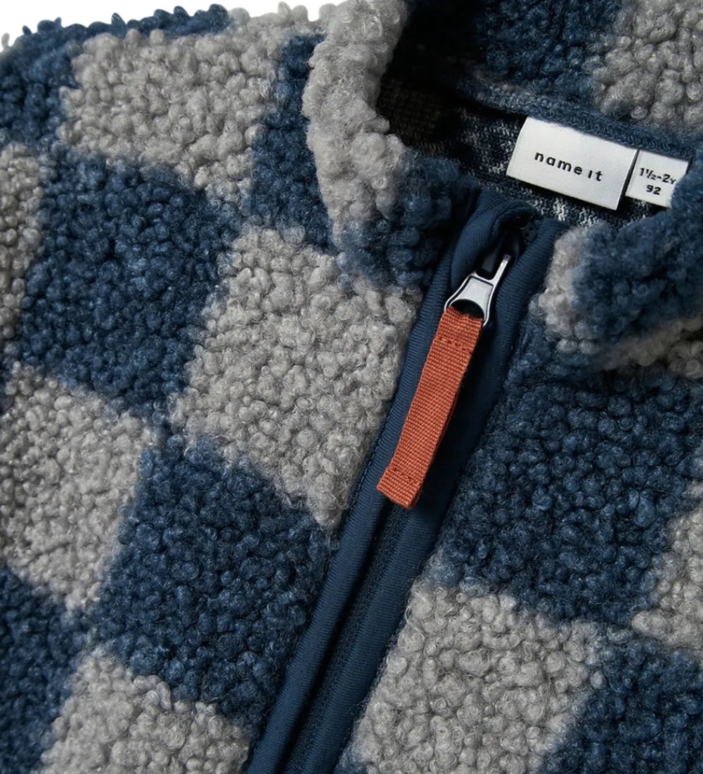Flot Name It fleecejakke med et ternet mønster i mørkeblå og gråblå. Fleecejakken er lavet i blødt teddyfleece med en høj krave. Den lukkes fortil med gennemgående lynlås med indvendig vindstolpe og hagebeskytter. Fleecejakken har lange ærmer og to rummelige forlommer.