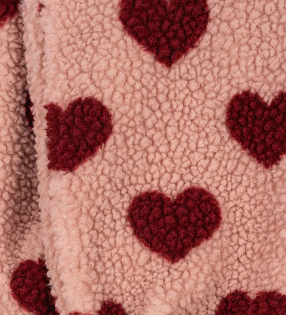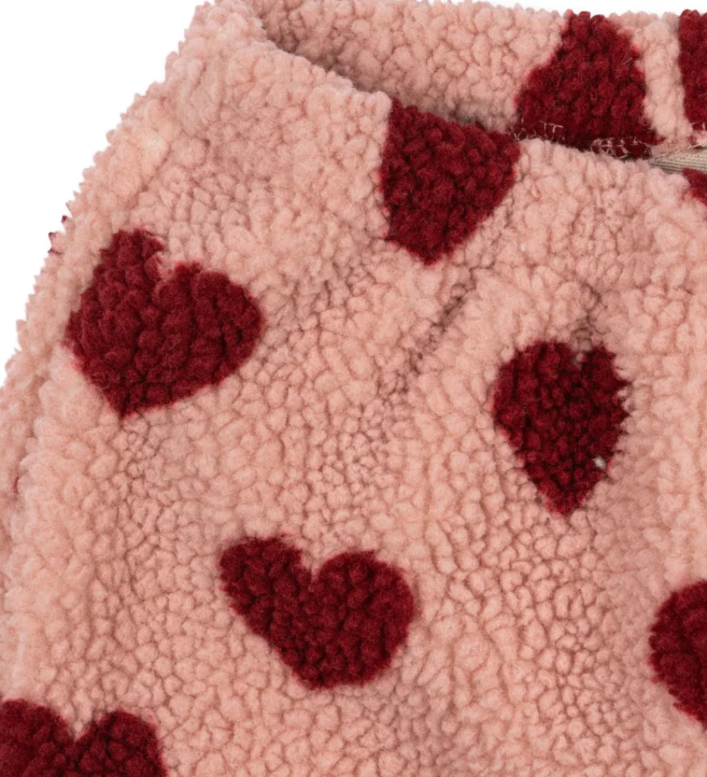 Lækre Konges Sløjd fleecebukser i lyserosa med et charmerende hjerteprint i rød.