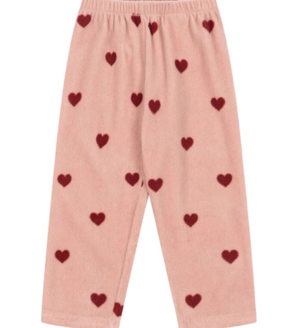 Praktiske Konges Sløjd fleecebukser i en smuk, lyserød farve prydet af røde hjerter.