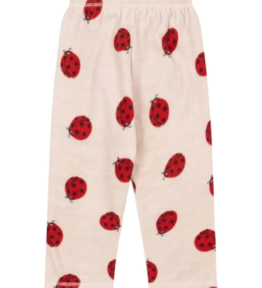 Fine Konges Sløjd fleecebukser i lyserosa, og med et alloverprint af mariehøns i rød. Konges Sløjd fleecebukserne har en bred elastikkant i livet, hvilket får bukserne til at sidde behageligt. Fleecebukserne er fremstillet i en lækker og blød kvalitet.