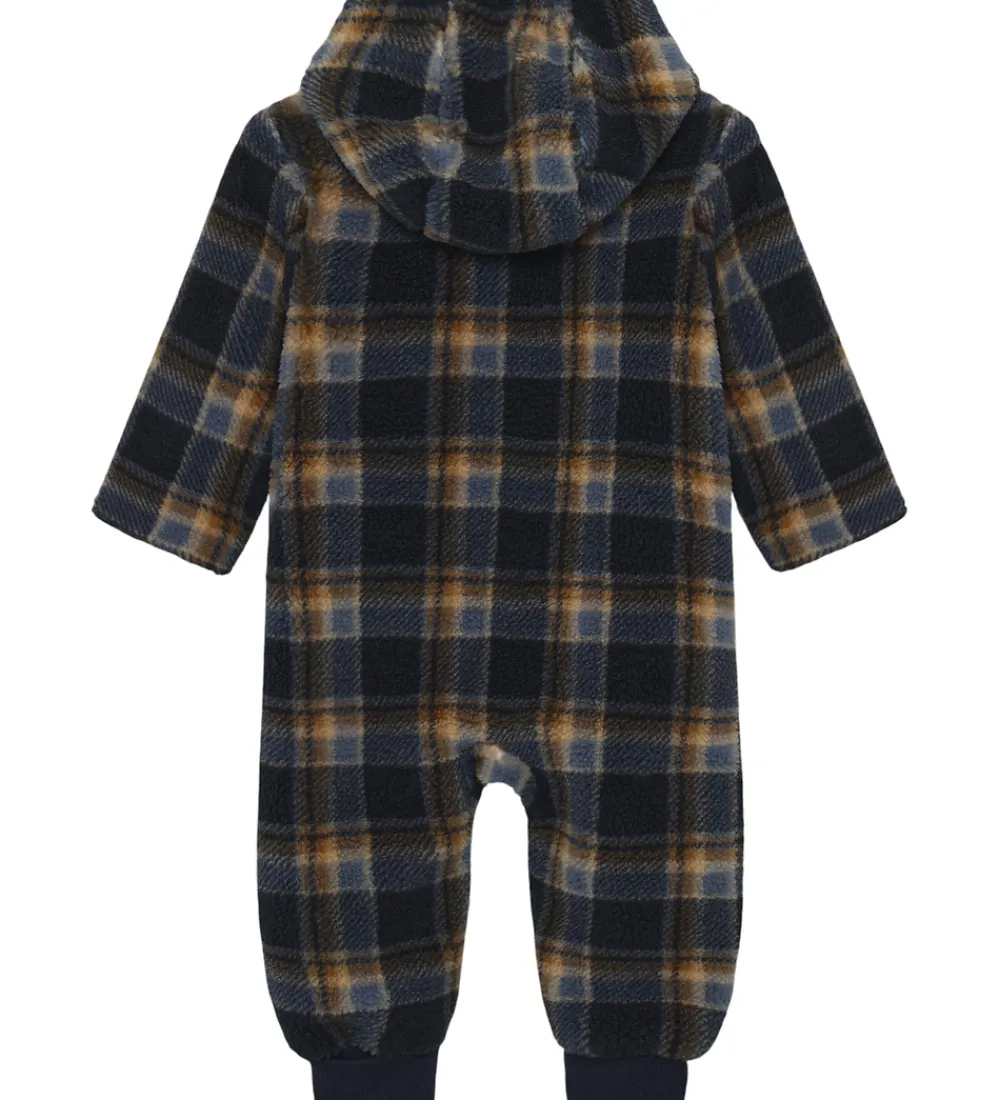 Smart Minymo fleecedragt med et ternet mønster i navy, beige og støvet blå.
