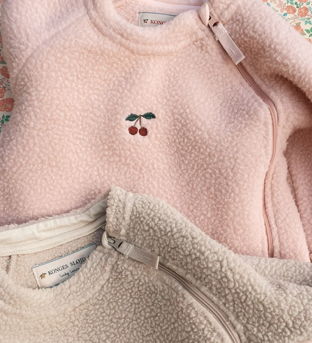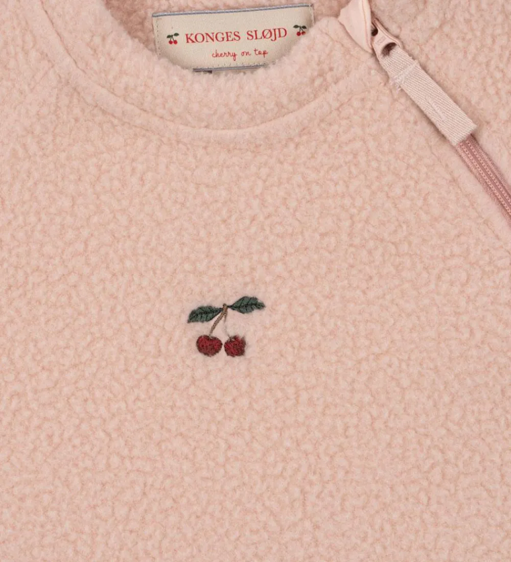 Lækker Konges Sløjd fleecedragt i lyserosa teddyfleece og med et lille, broderet kirsebær.